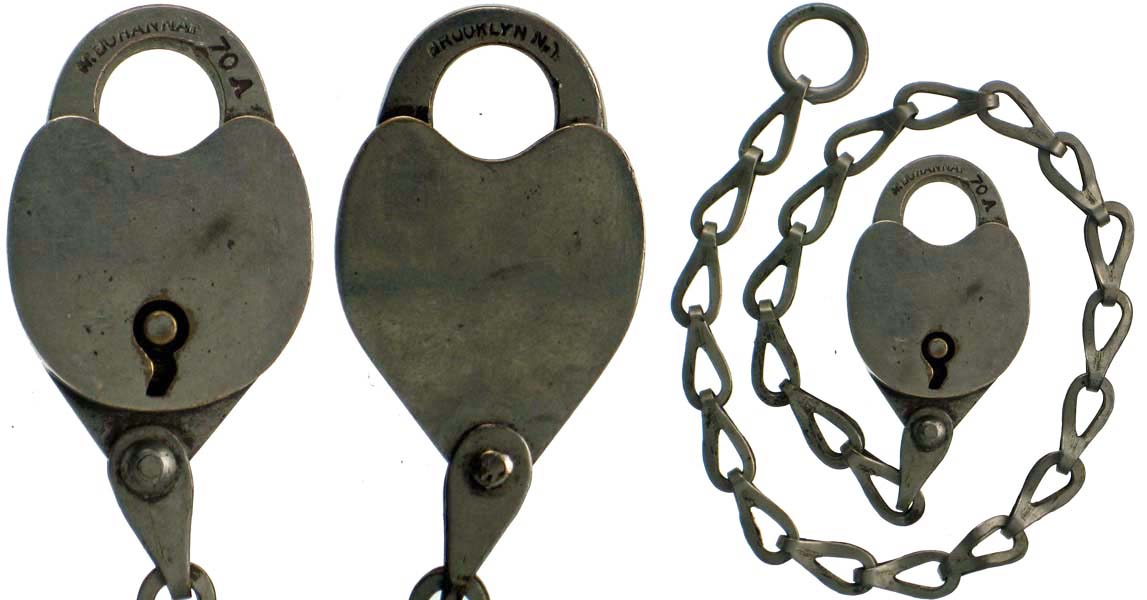 1 1/8″ wide. (actual: 1.118″ wide x 1.454″ high x .298″ deep). Bronze body. Bronze shackle. Post key. Catalog #: 70A, first appears in catalog of 1886. Clevis and chain. “W. BOHANNAN 70A” is stamped on the obverse of the shackle. It is rare to find a Nickel Plated example completely intact.
