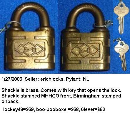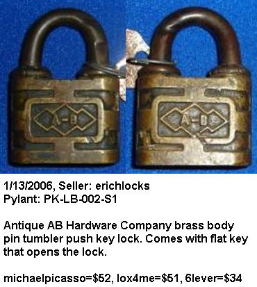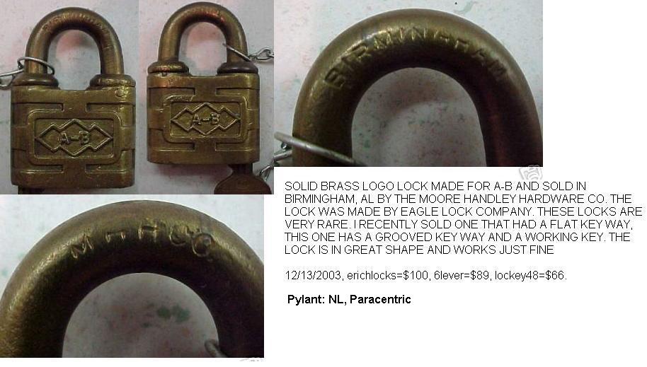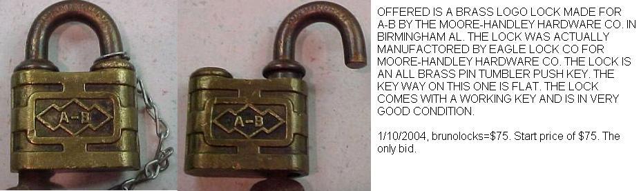 “A.B. CO.”. 2″ wide. Brass body. Brass shackle.