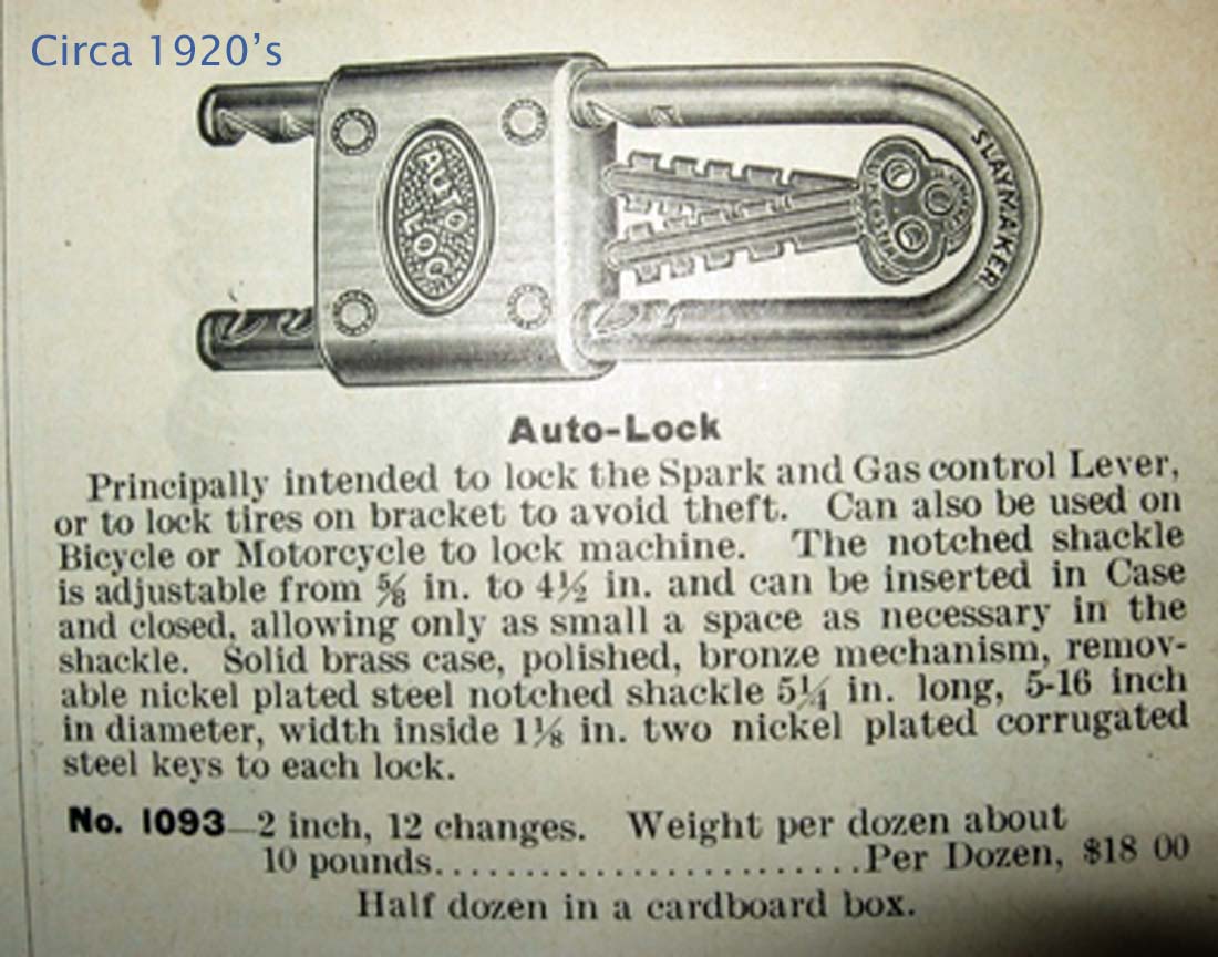 Brass body. Steel shackle. Warded. Auto steering wheel, break and gear levers lock.Patent #1261423. More… More…