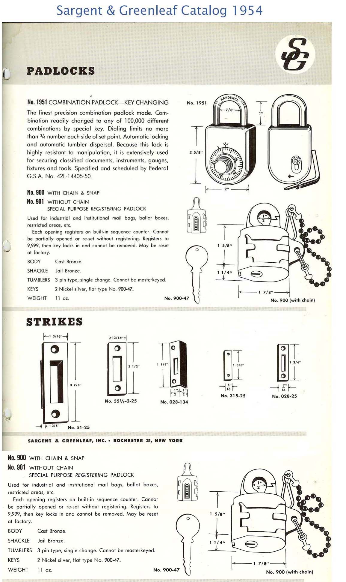 2 5/8″ high x 2.1″ wide 2.2″ deep. Cast Brass body. Brass shackle. Pin tumbler. 3 pins. Flat key. This lock was used by Douglas Aircraft in the 1940’s & 1950’s.