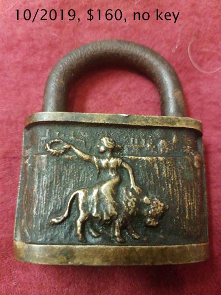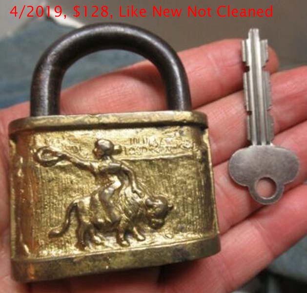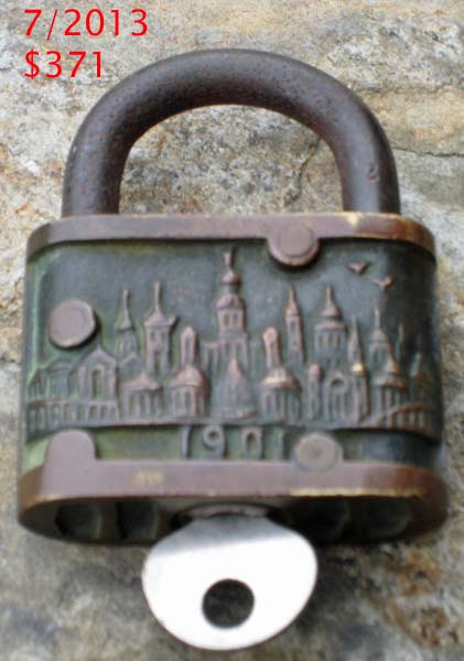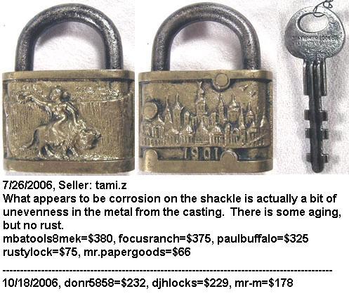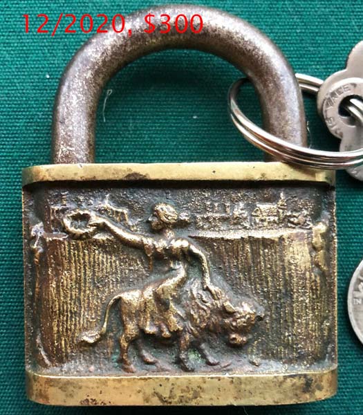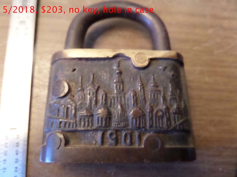 “Pan-American Exposition” was the title of the 1901 Buffalo New York World’s Fair. 2 3/4″ high x 2 1/8″ wide. “1901” is not cast on the reverse of the case at 6 o’clock. Brass body. Steel shackle. Warded. Corrugated key. Catalog #: 1901 PA.