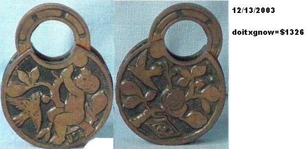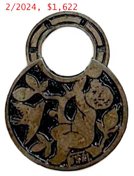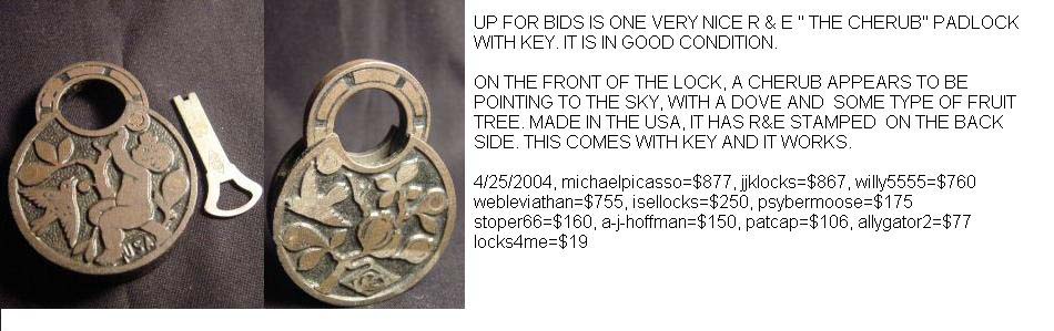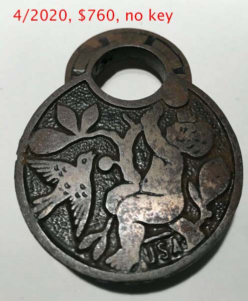 2 1/2″ wide. “USA” is not cast on the obverse of the case at 5 o’clock. The R&E Co. trademark is cast on the reverse of the case at 6 o’clock. Iron body. Iron shackle. Push Key. This lock was available in 2 finishes: Florentine Bronze, and Kahal Bronze.Patent # D11308 (same as the “Japanese Pattern”). More…