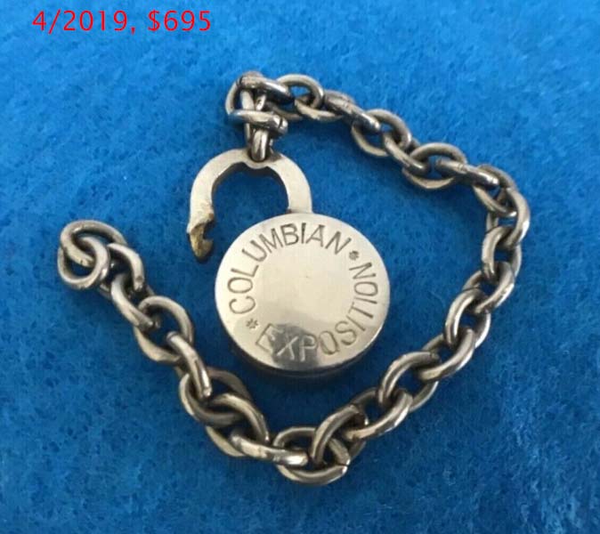 .815″ high x .560″ wide x .210″ deep. All brass. Nickel plated finish. The lock opens by inserting a pin on the side of the body. Commemorates the 400th Anniversary of Columbus Discovering America. “The World’s Columbian Exposition” was the title of the 1893 Chicago Illinois World’s Fair. We believe the watch fob was sold seperatly.Patent # 373218.