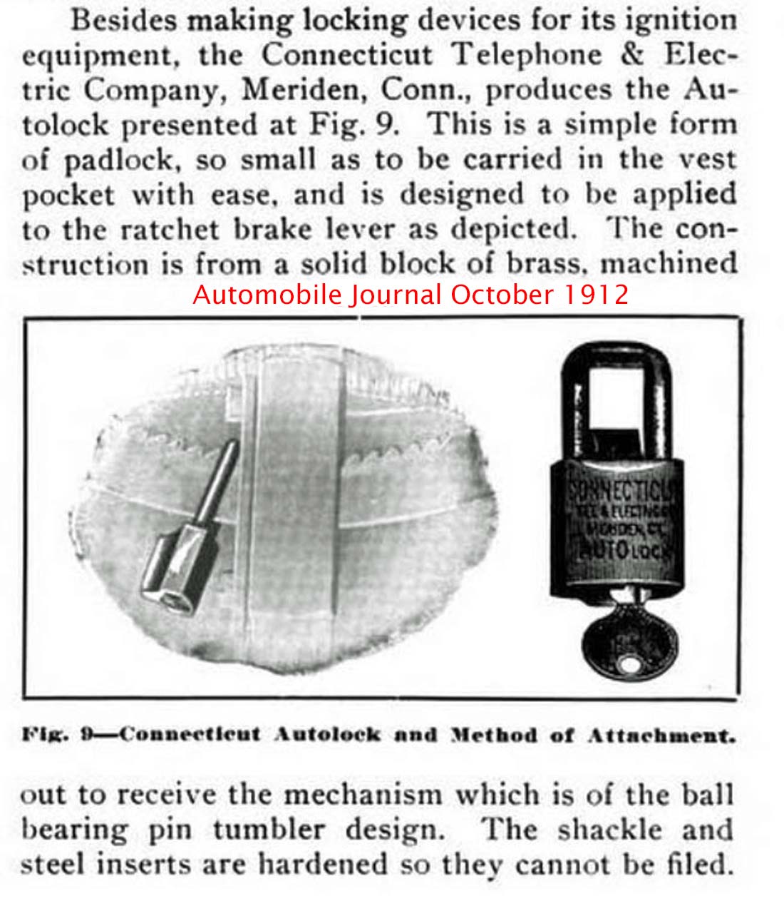MERIDEN, CT. AUTO LOCK”. 2 1/4″ high. Brass body. Steel shackle. Adjustable shackle. General auto use.Patent #1120117. More…