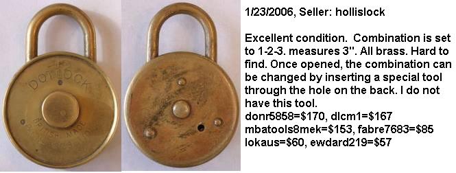 3″ high x 2″ diameter. Brass body. Brass shackle. Brass dial. “DOT LOCK BRITISH MADE PAT No 9878.-(’10)” is stamped on the obverse of the body. The hole on the reverse of the case receives a tool to change the combination. “DOT” stands for “Defiance of Thieves”. This lock has a gear mechanism.Patent #1006366. US Patent #1393269. More…