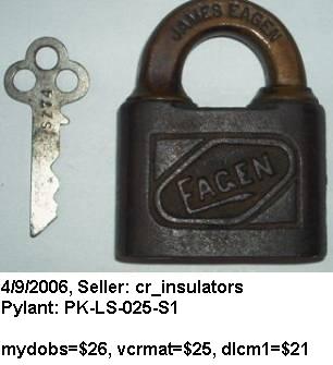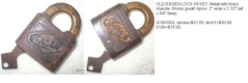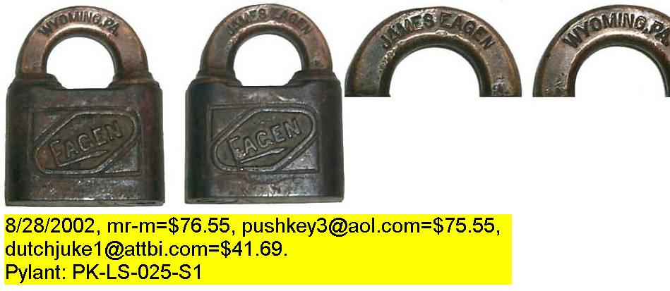 3 1/8″ high x 2″ wide x 1/2″ deep. Brass body. Brass shackle. “JAMES EAGEN” is stamped on the obverse of the shackle.