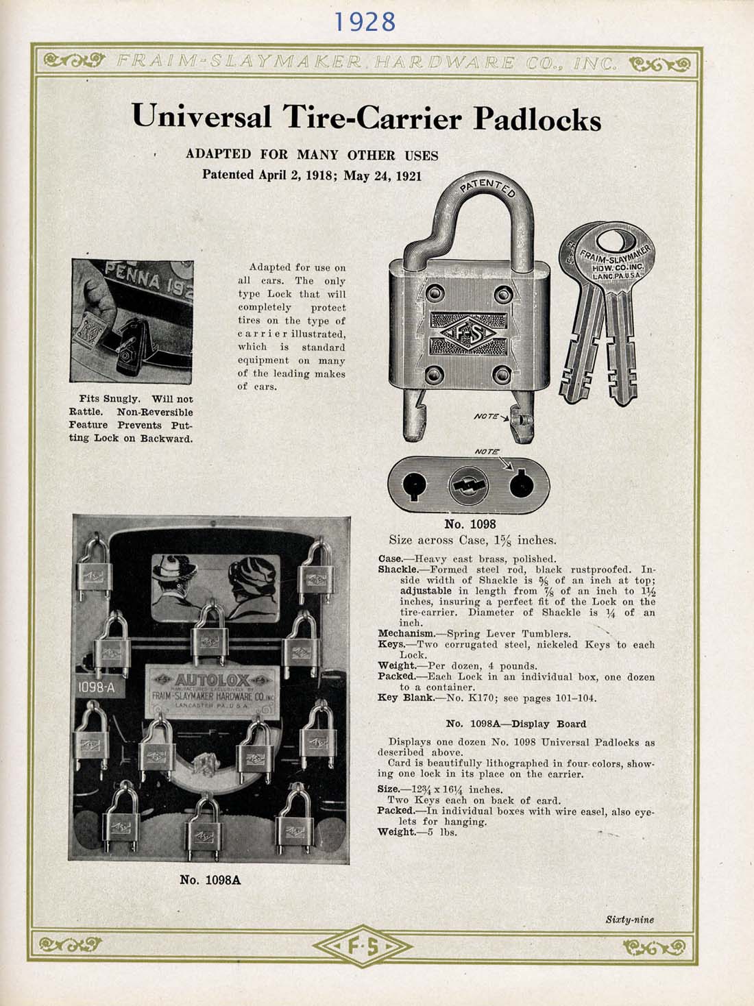 Brass body. Steel shackle. Warded. Auto spare tire lock.Patent #1379120. More… US Patent #11542442.