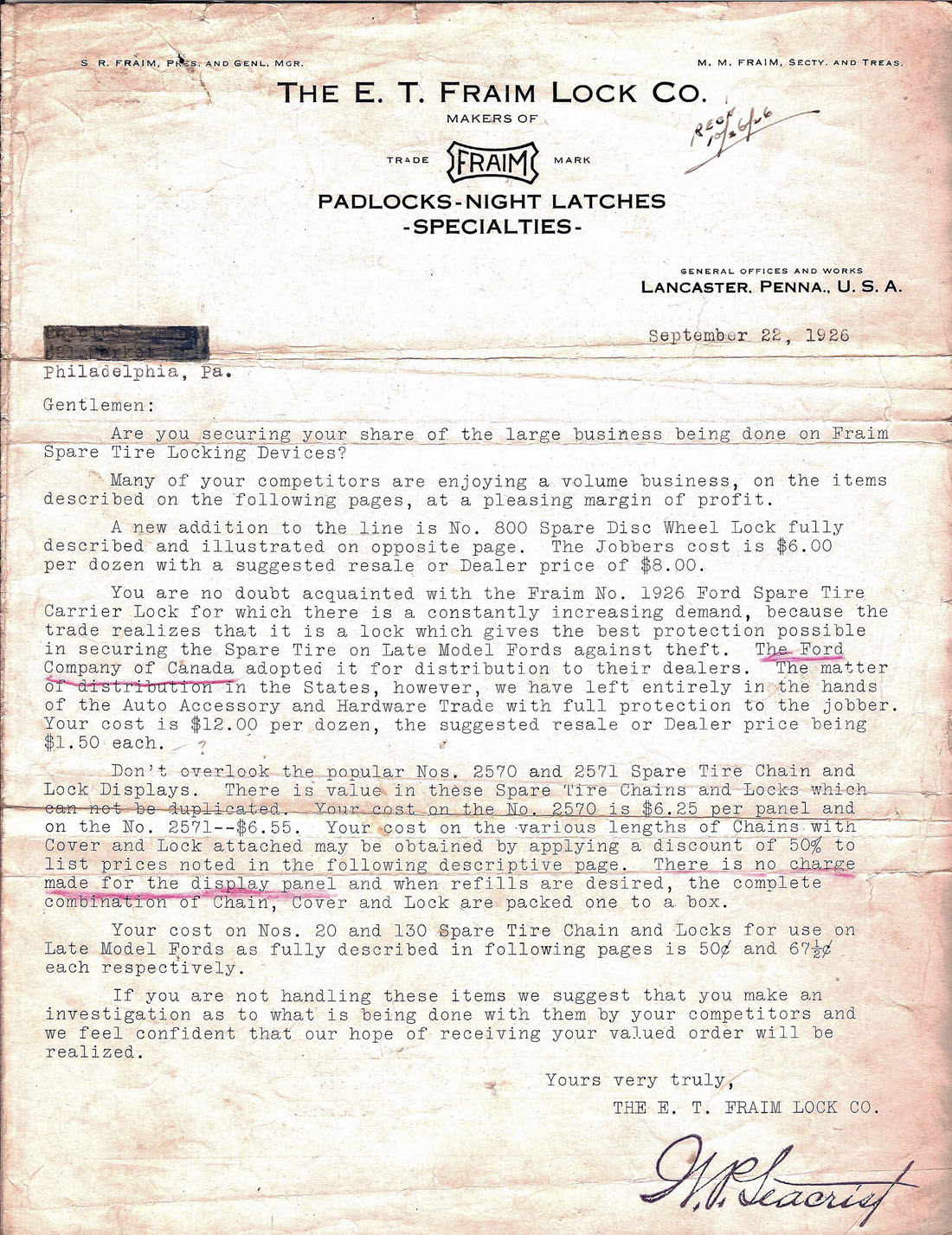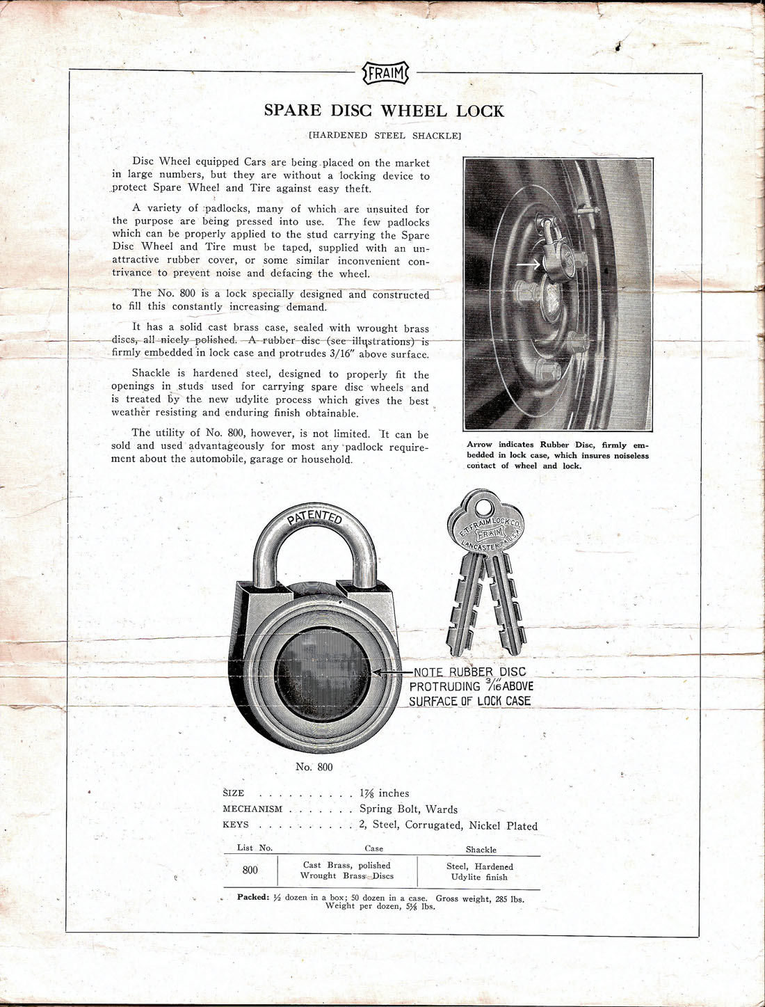 …”. Brass body. Steel shackle. Warded. There is a leather bumber on the reverse of the body. Auto spare tire lock for disc wheels.