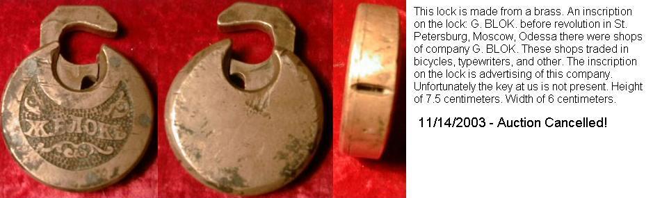 “G. BLOK” – No Pins. 2.364″ diameter. Before the revolution in St. Petersburg, Moscow, Odessa there were shops called G. BLOK. They sold bicycles, typewriters, and other hardware.
