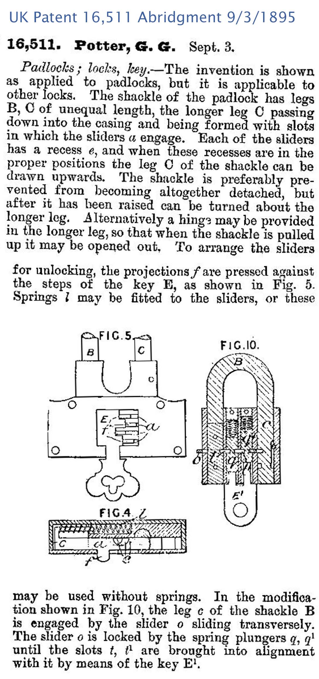 “G. G. P. PAT. 24”. 2 3/4″ high x 2 3/4″ wide. Steel body. Brass face plate. Brass shackle. “G. G. P.” represents “G. G. Potter”.Patent #16511. There is a US variation of this lock that we have not found as yet US Patent #1401030.