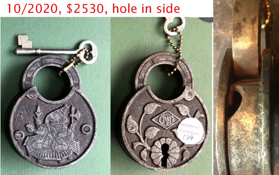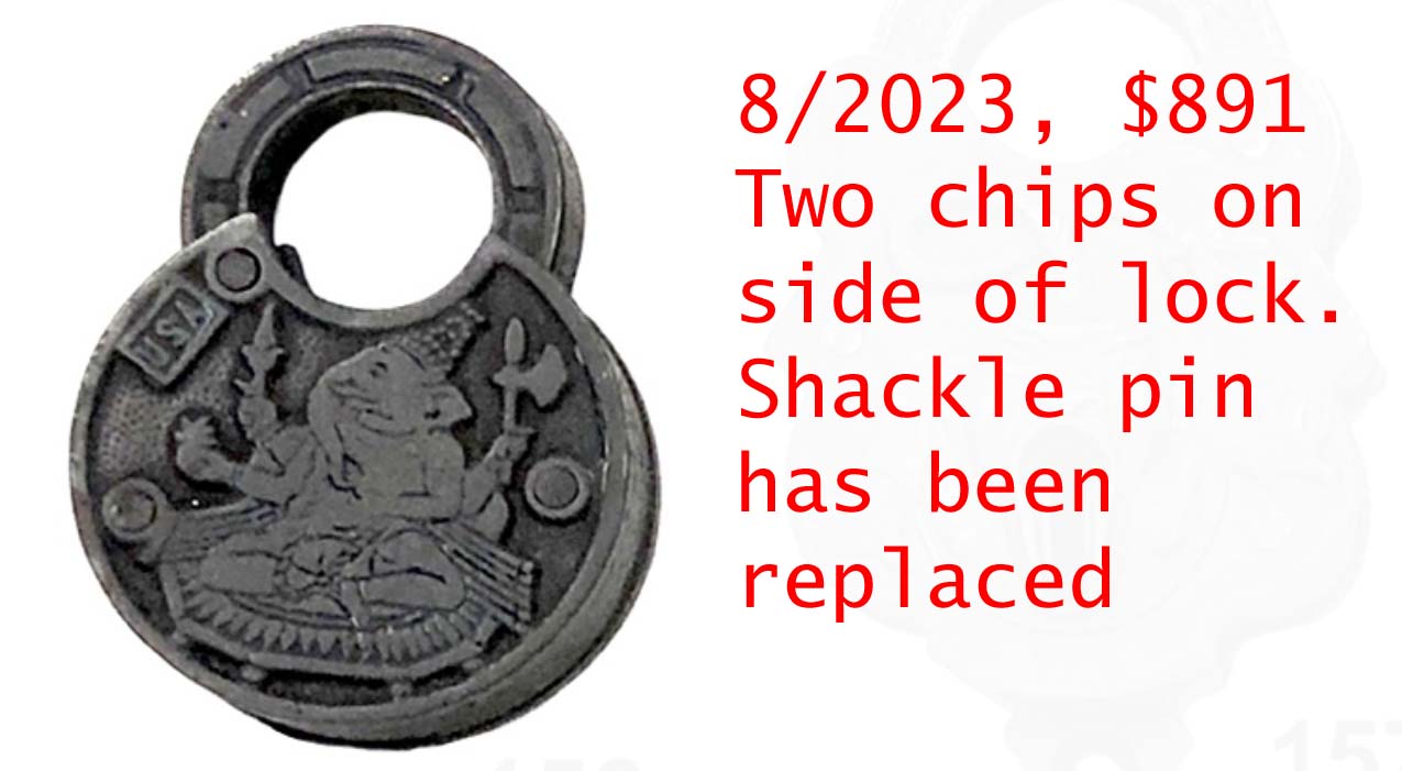 3.358″ high x 2.532″ wide. Iron body. Iron shackle. Barrel key. The R&E Co. trademark is cast on the obverse of the case in the center. “U S A” is not cast on the reverse of the case at 10 o’clock. The design aspects are different than that of #589 due to the size difference.Patent # D11308 (same as the “Japanese Pattern”).