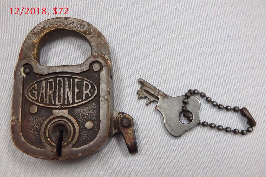 3″ high x 2″ wide. Cast Brass body. Flat brass shackle. Flat key. Not determined.