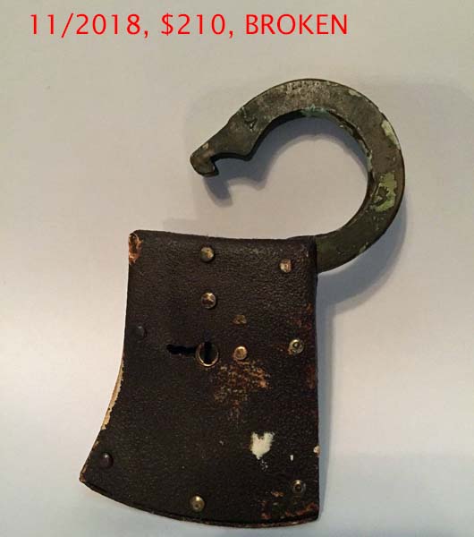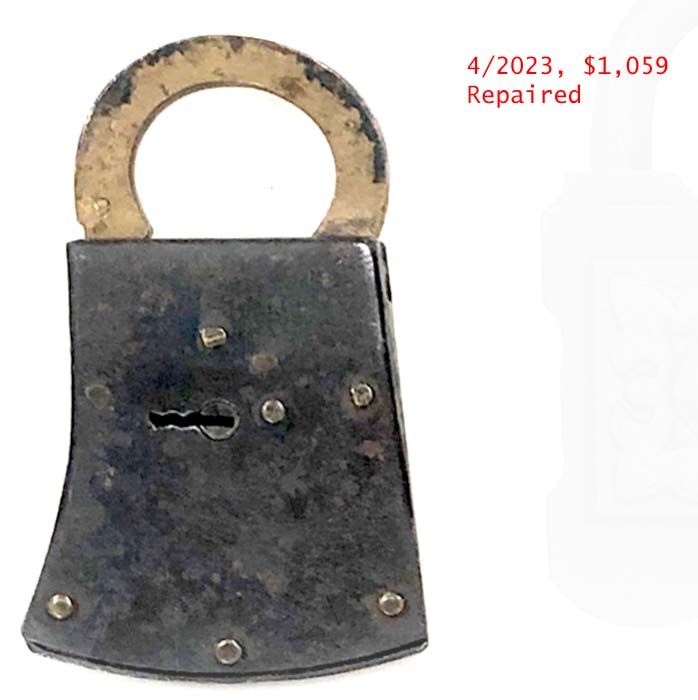 3 3/4″ high x 2 1/4″ wide. Stamped Steel body. Brass shackle.Patent # D33778.