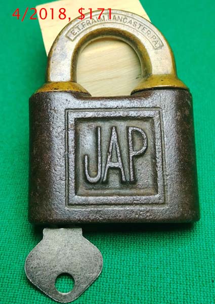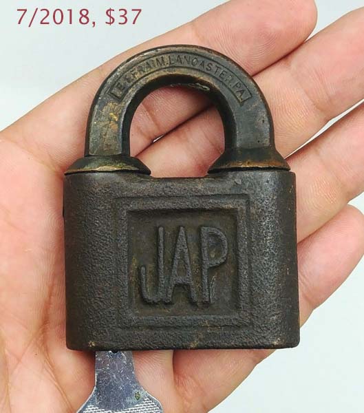 2″ high x 6 1/2″ wide. High copper content Brass body. High copper content brass shackle. The key is old but not original. Compressed spring mecanism in very typical Edo period shape. Overall “Fire Gilt” finish using mercury and gold.