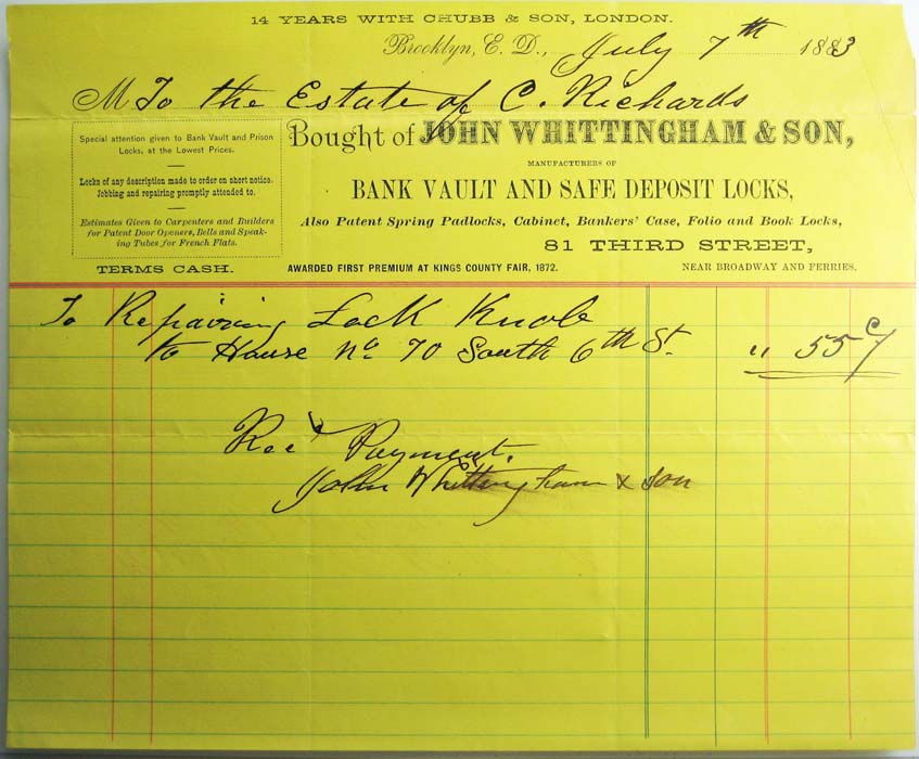 Y.”. 1 1/2″ wide (actual: 1.452 wide x 1.917 high, 0.398 deep). Brass body. Brass shackle. Patent (46,539) spring rack tumbler. Catalog #: 2, first appears in catalog of 1869. Post key.Patent # 46539. More…