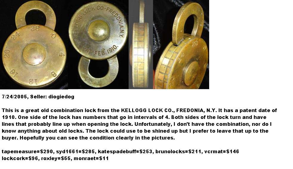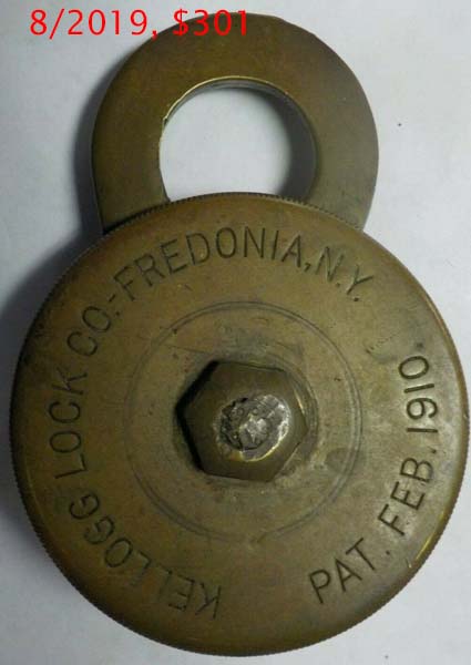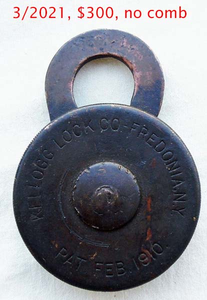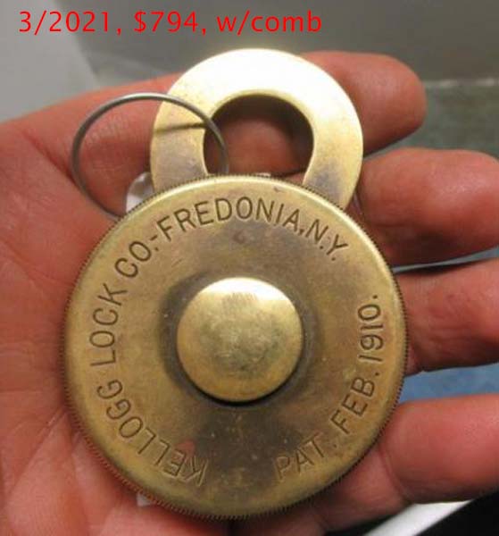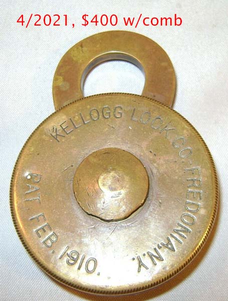 3 1/4″ high x 2 1/2″ diameter. Brass body. Brass shackle. Brass dials. The combination for this lock is changeable.Patent #548757. US Patent #947994. More…