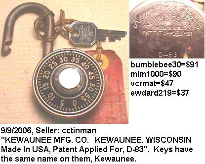 Home Gallery ← Combination Padlocks “KEWAUNEE MFG CO KEWAUNEE WI PATENT APPLIED FOR”
