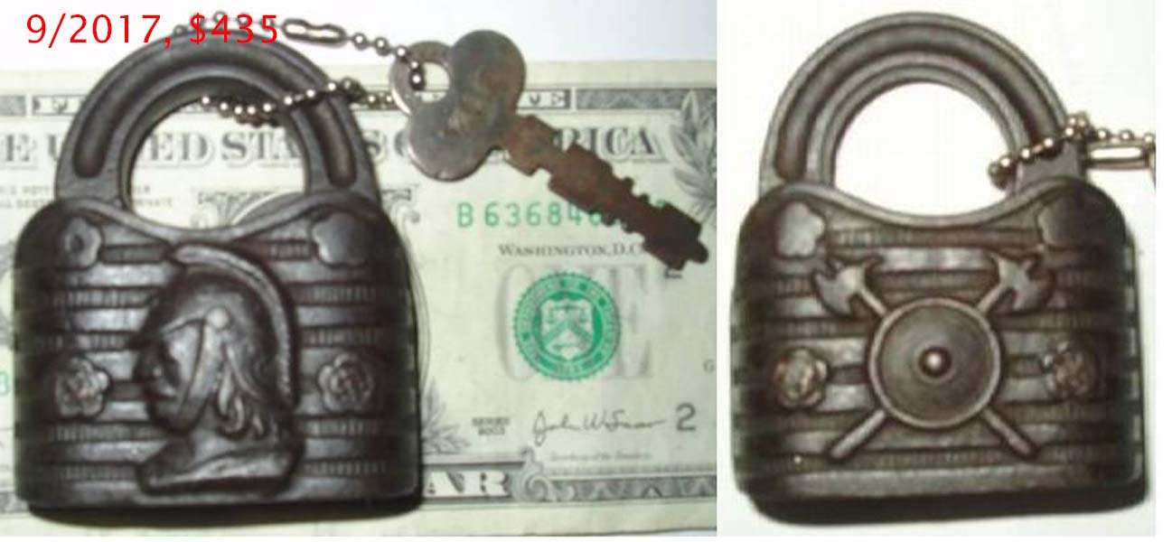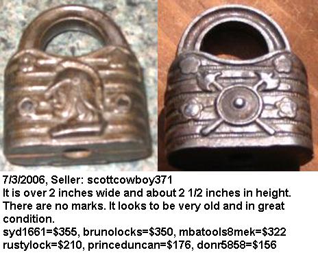 2 1/4″ high x 1 7/8″ wide. Iron body. Iron shackle. Warded. Curved recess shackle. This padlock is similar to the John Gerard “Eagle Liberty” in size and shape. The curved recess shackle is characteristic of other John Gerard designs. Some molds have very minor size and detail differences.