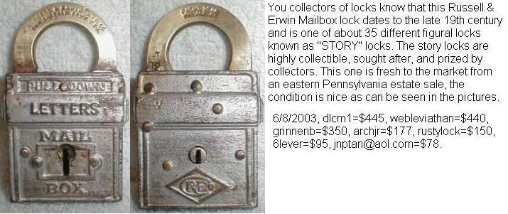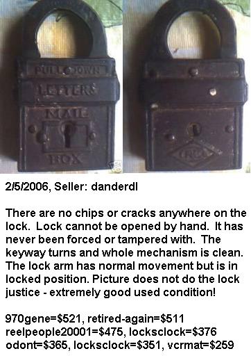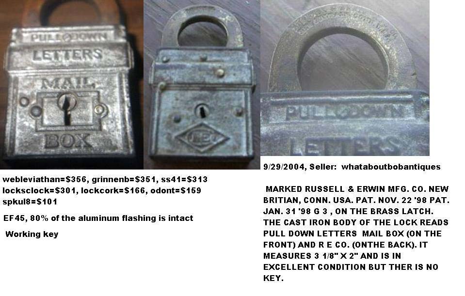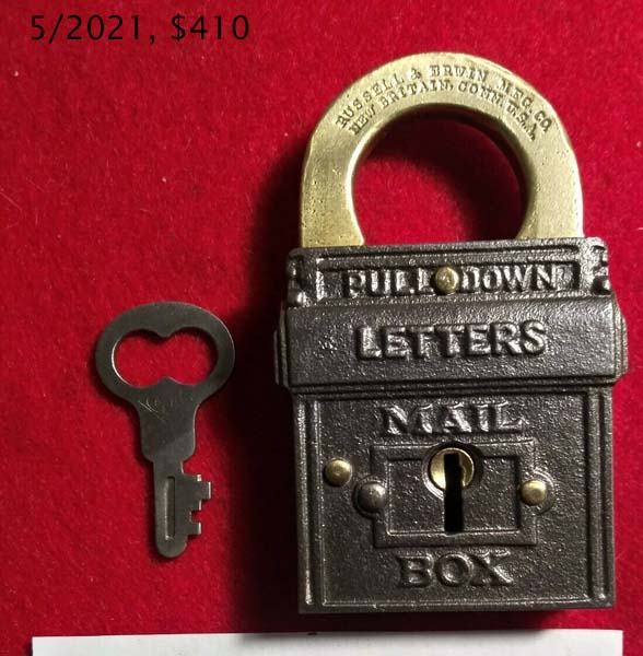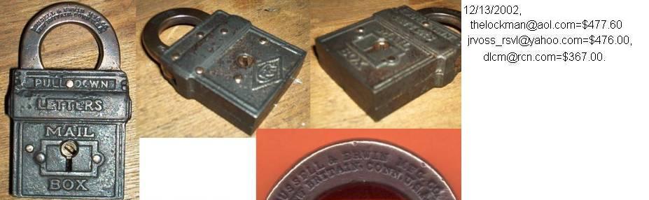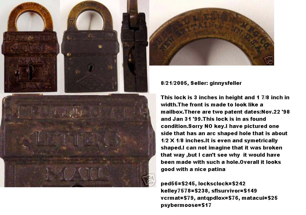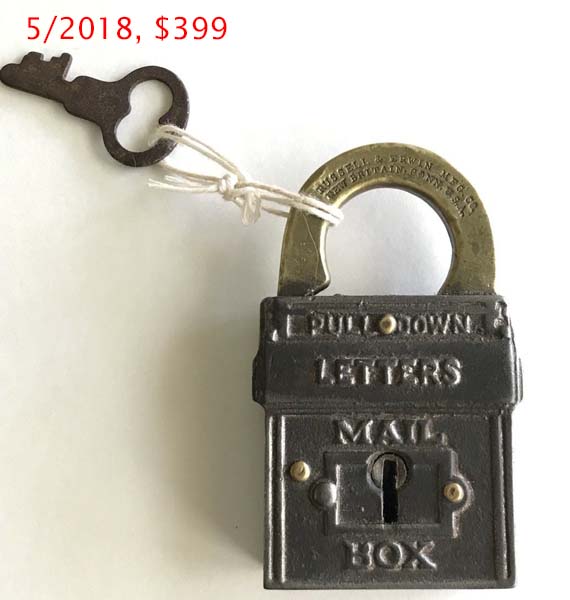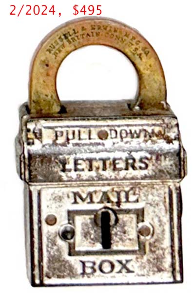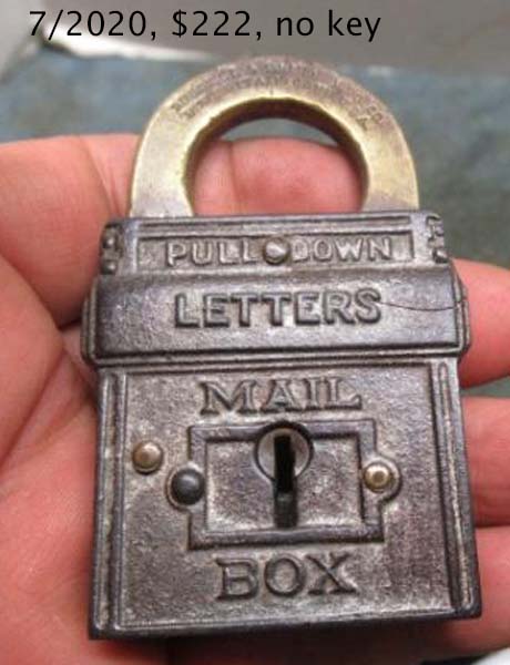 3 1/8″ high x 1 3/4″ wide (Actual: 3.150″ high x 1.760″ wide). Iron body. Brass shackle. Aluminum finish. Lever. Flat key. “PAT.NOV.22.98. PAT.JAN.31.99.” is stamped on the reverse of the shackle.Patent # D29701 (“Mail Pouch”), Henry G. Voight Patent # 618487. A subsequent Louis H. Wales Design Patent # D32619 was issued. More…