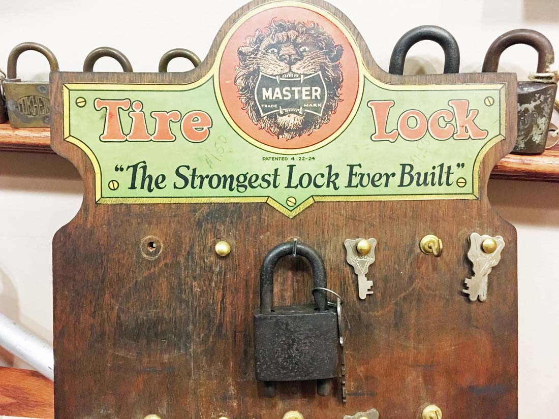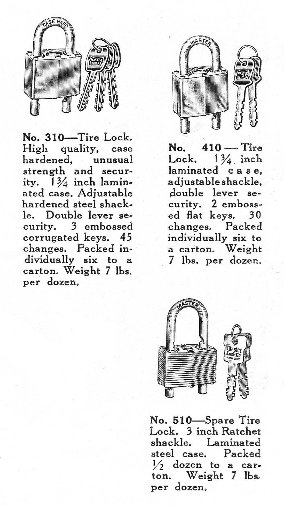 …”. Laminated Steel body. Steel shackle. Warded. Original key. Auto spare tire lock.