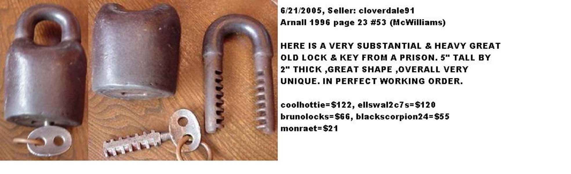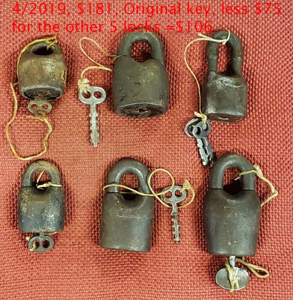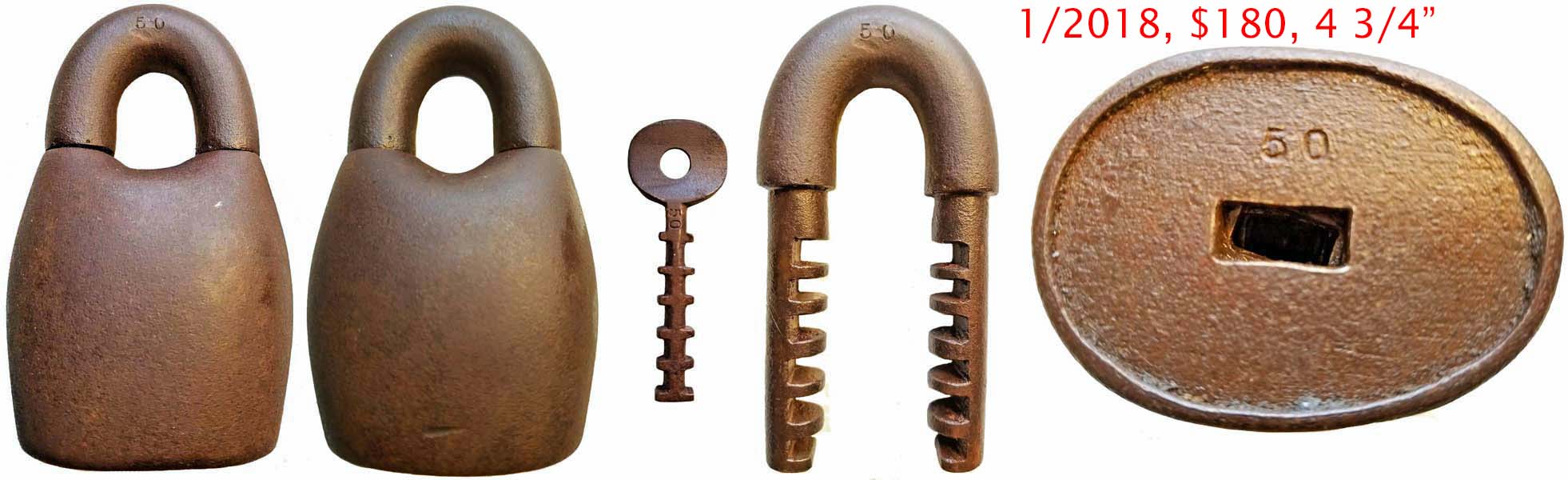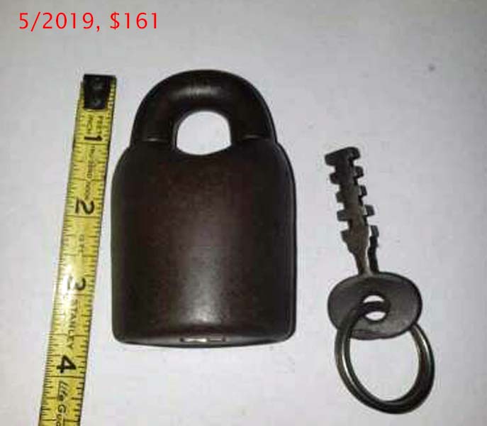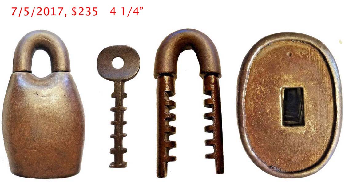 3 3/4″ high. Iron body. Iron Shackle. Original iron post key. This is an early narrow shackle opening matching the Original Patent Model.Patent #’s 116977 RE7122. More…