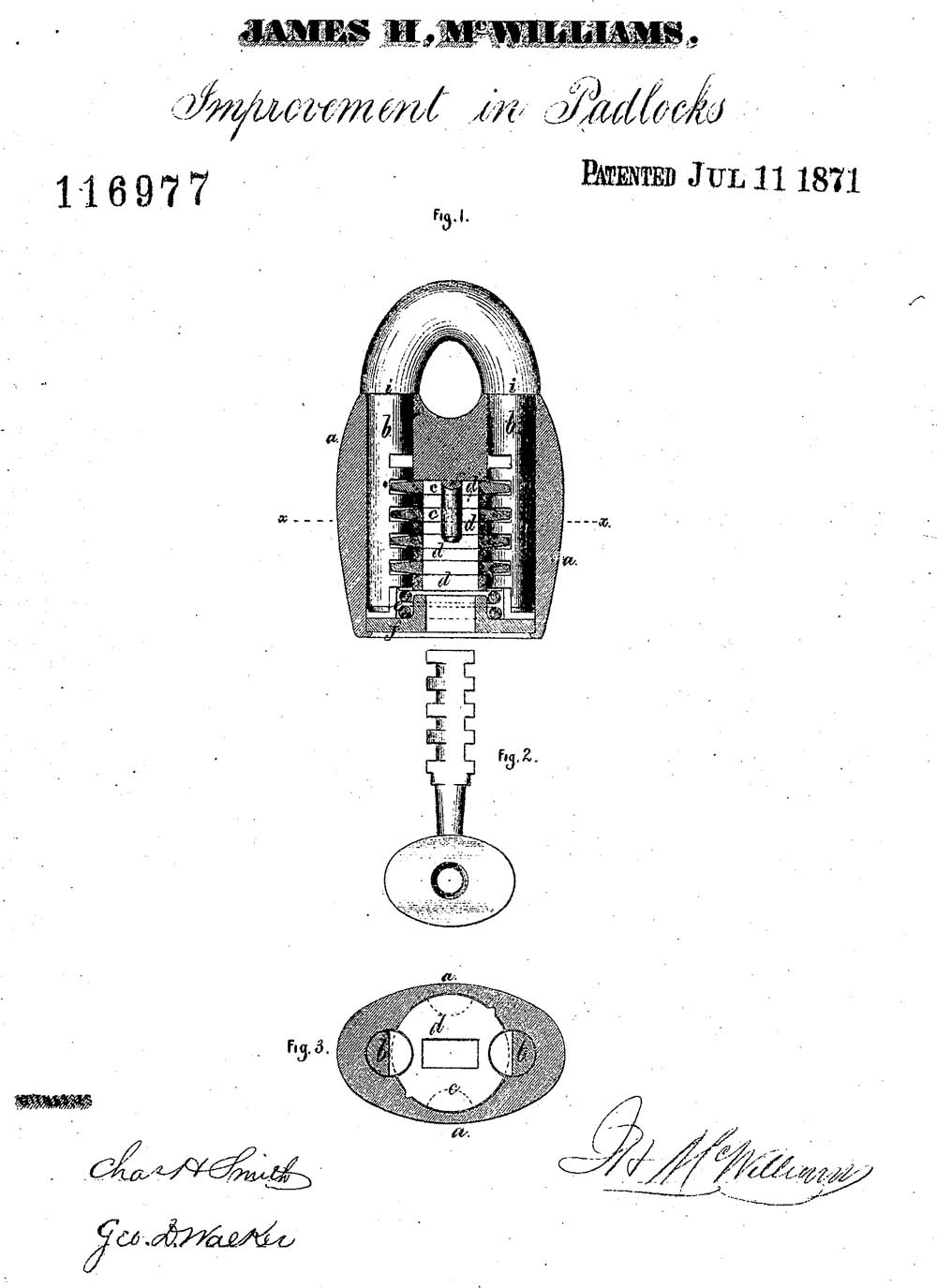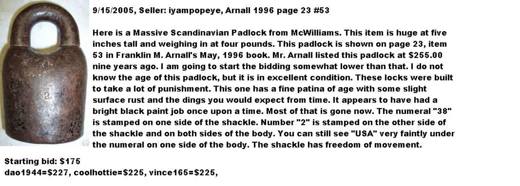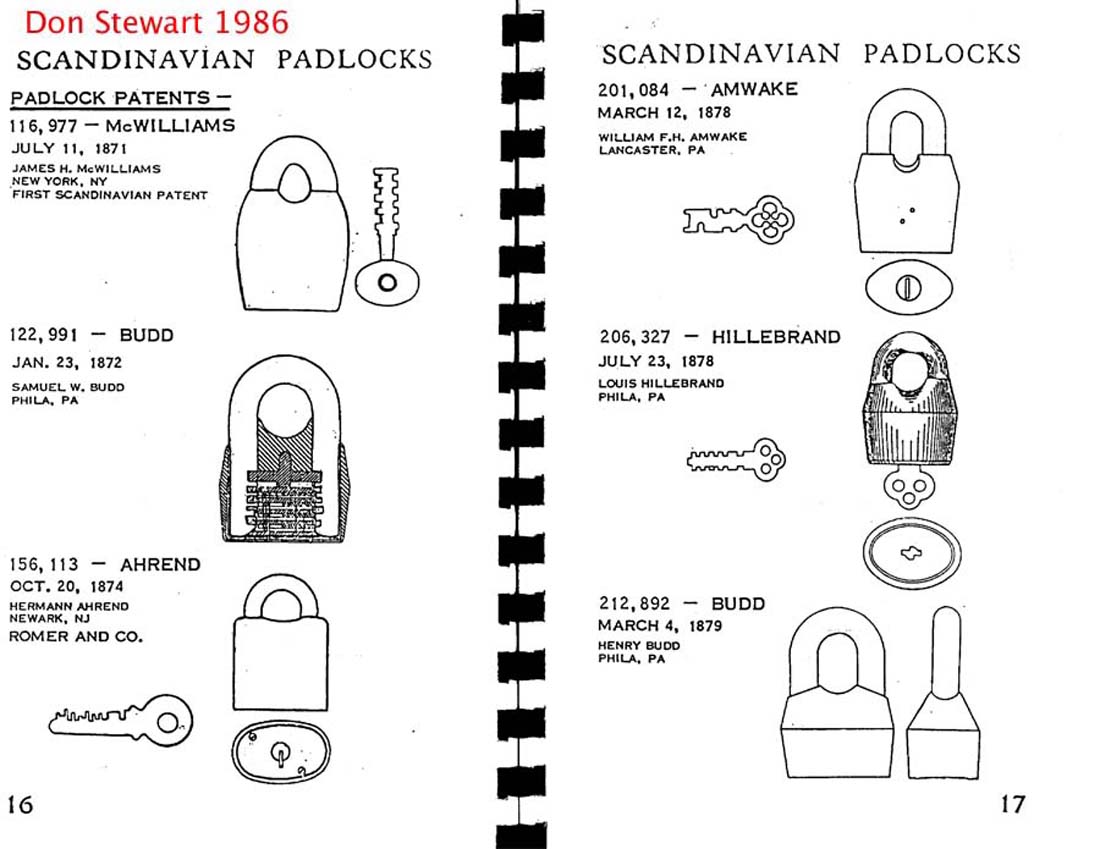 3 3/4″ high. Iron body. Iron Shackle. Original iron post key. This is an early narrow shackle opening matching the Original Patent Model.Patent #’s 116977 RE7122. More…