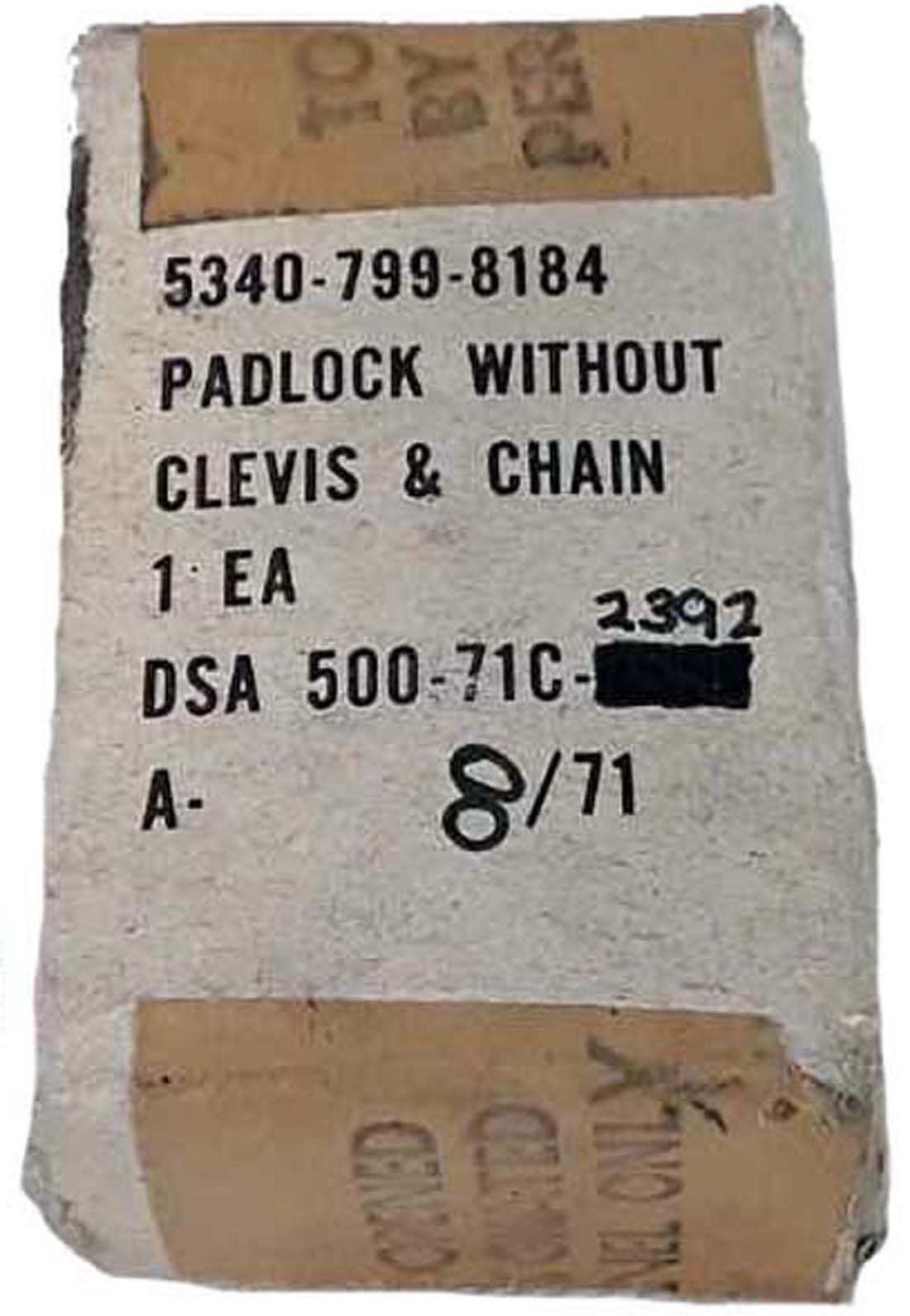 MOD SPL U.S.”. Laminated steel body. Steel shackle. Wafer tumbler mechanism. This lock was manufactured prior to the patent being granted. It is not clear when the government terminated use of this lock.
