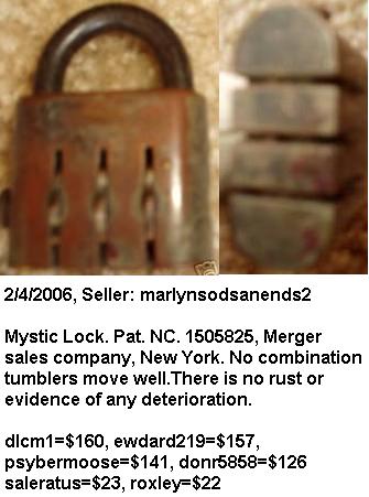NO. 1505825 MERGER SALES CO, N.Y.”. 2 1/8″ x 1 1/2″ wide x 5/8″ deep. Steel body. Steel shackle. Steel wheels. Nickel plate finish. Set wheels in the proper position then pull the knob to release the shackle.Patent # 1505825.