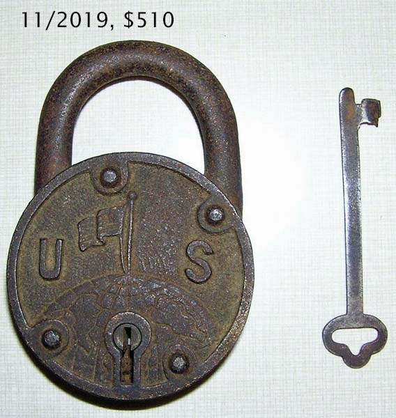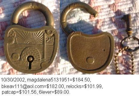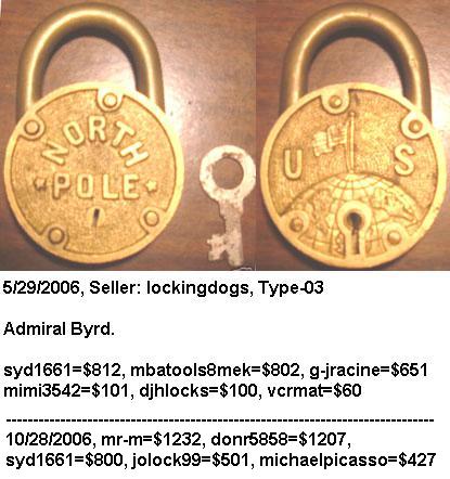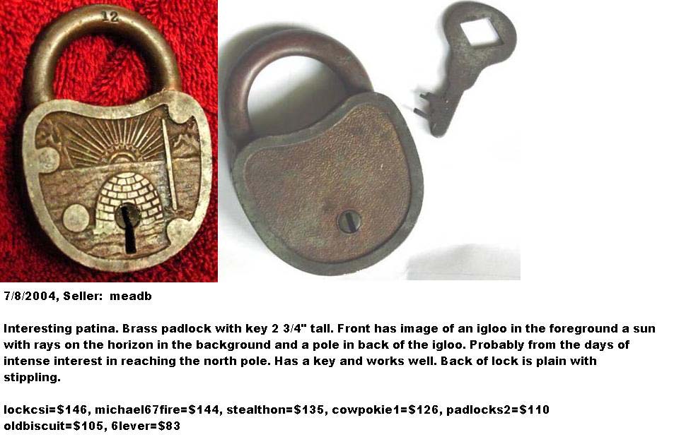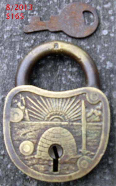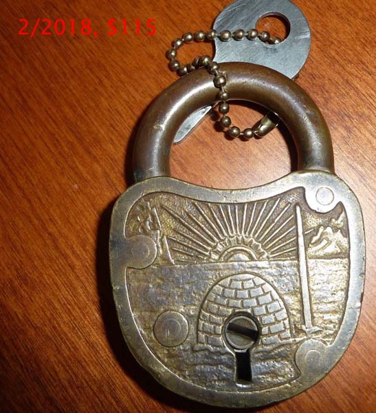 also known as Igloo. 2.745″ high x 2.013″ wide x .488″ deep. Commemorates the Admiral Richard E. Byrd Antarctic expeditions. Born on October 25, 1888 and died on March 12, 1957. Brass body. Brass shackle. Lever. Flat Key.