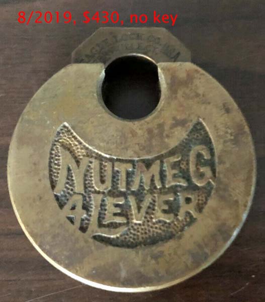 “EAGLE LOCK CO. TERRYVILLE CT. USA” is stamped on the obverse of the shackle. “The Nutmeg State” is the unofficial nickname for Connecticut. It was the intent of The Eagle Lock Co to illuminate this.