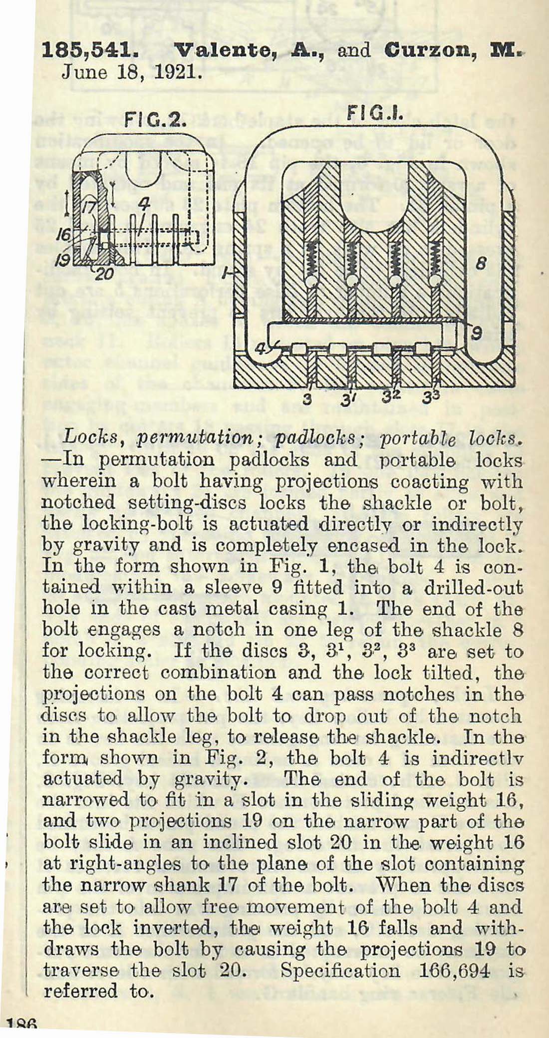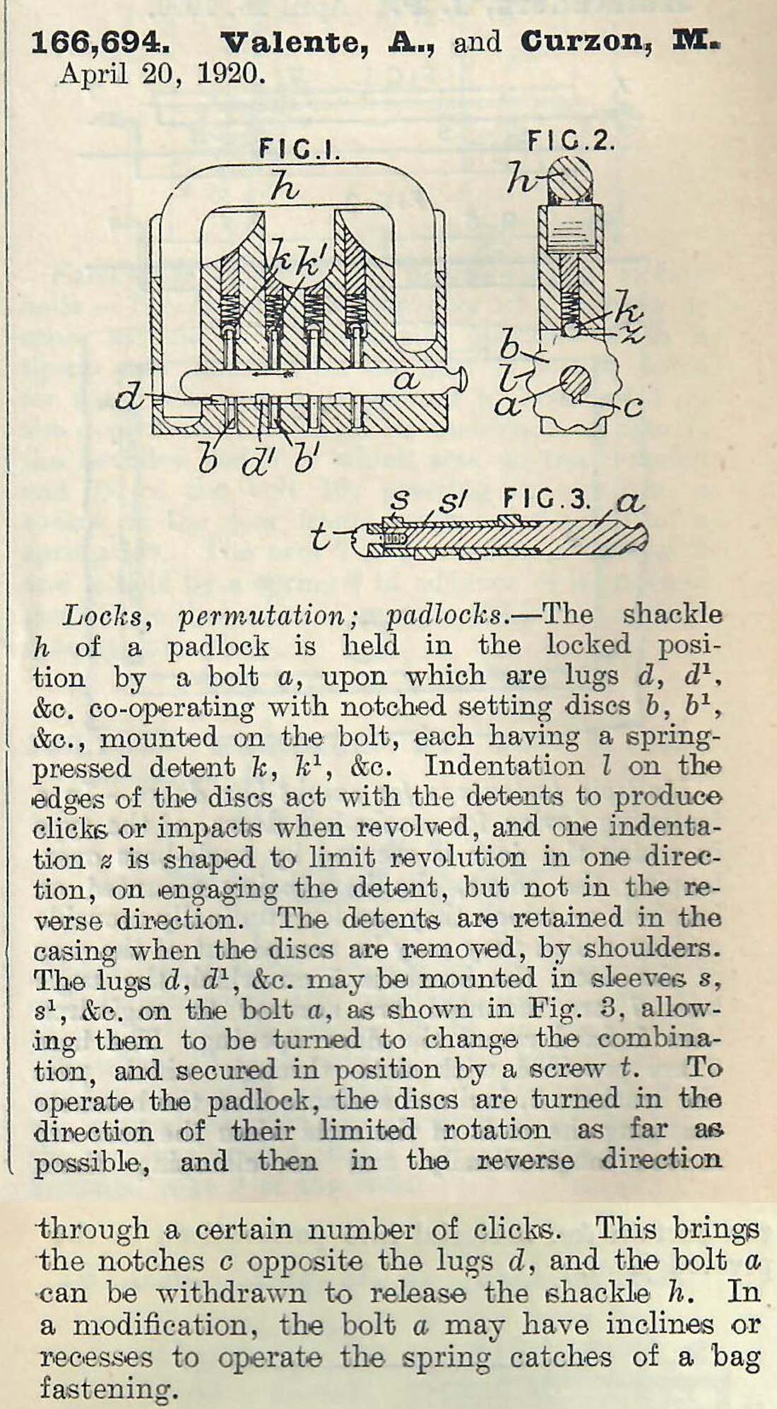 PATENT No 16805″. 2 3/8″ high x 1 15/16″ wide. Brass body. Steel shackle. Brass wheels. We believe this lock operates like the ‘MYSTIC’ lock excepting that the knob is missing.Patent #166694. UK Patent #185541. See also INSURANCE LOCK.