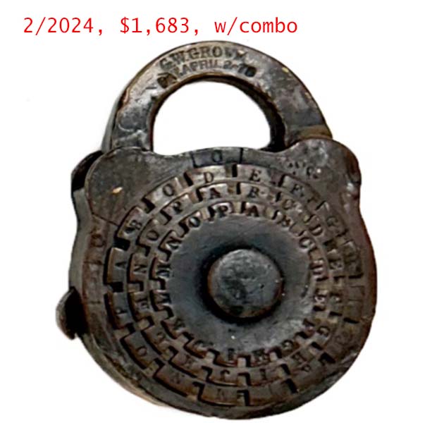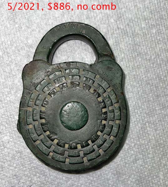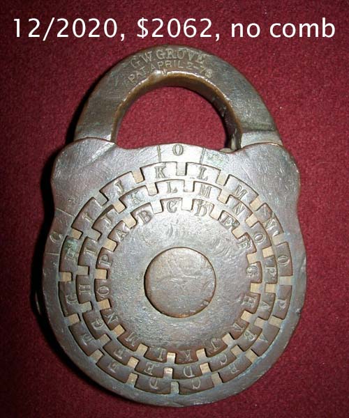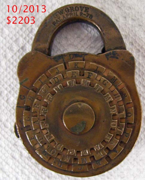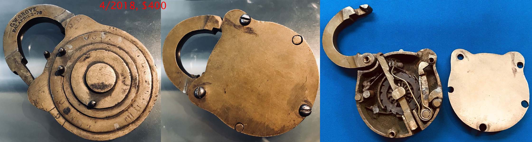 “R. PATON 26 GROVE ST N.Y.”. 1 3/4″ wide. Brass body. Brass shackle. Patent spring rack tumbler. Catalog #: 3, 1869. Post key.