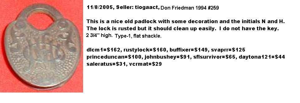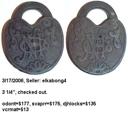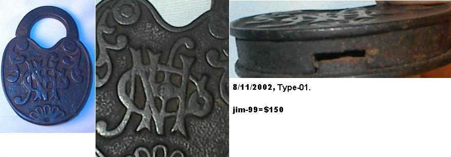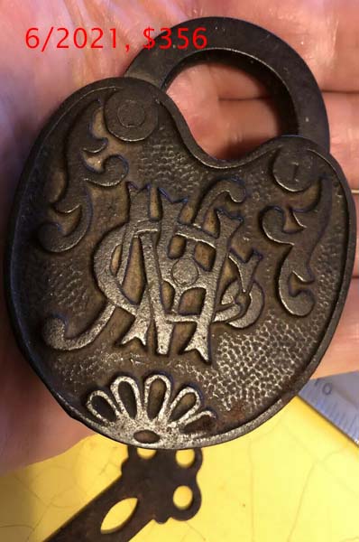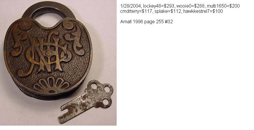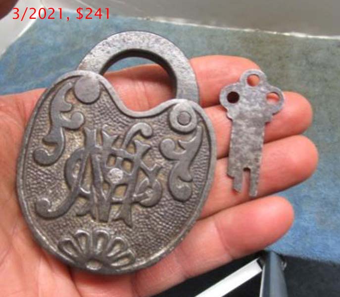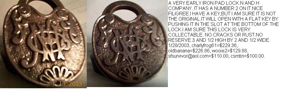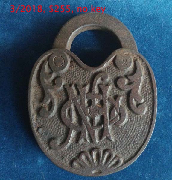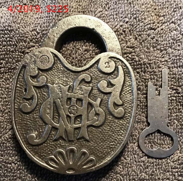 3 5/16″ high x 2 7/16″ wide. Iron body. Iron shackle. Push key. Operating key. 75% of the original lacquer is intact. “NHCo” is intertwined on the reverse of the body. Curved recess shackle.