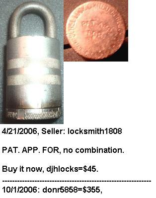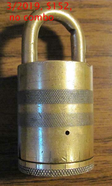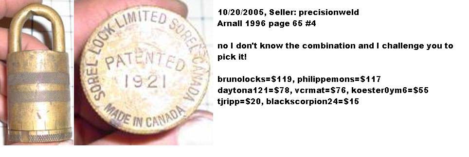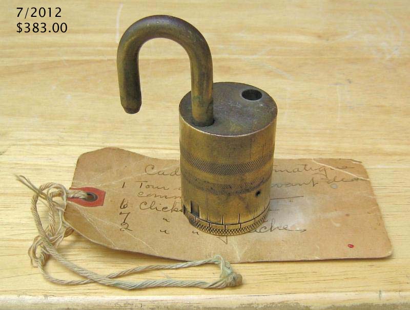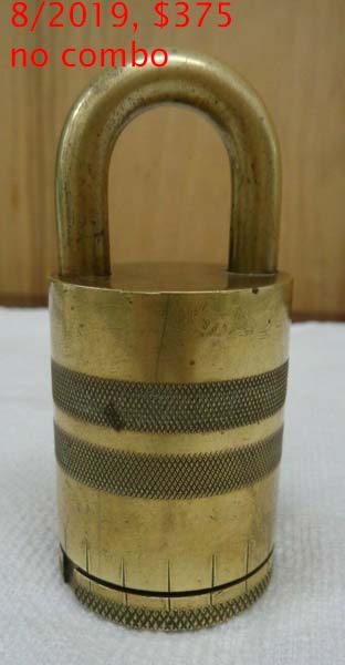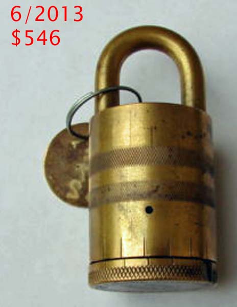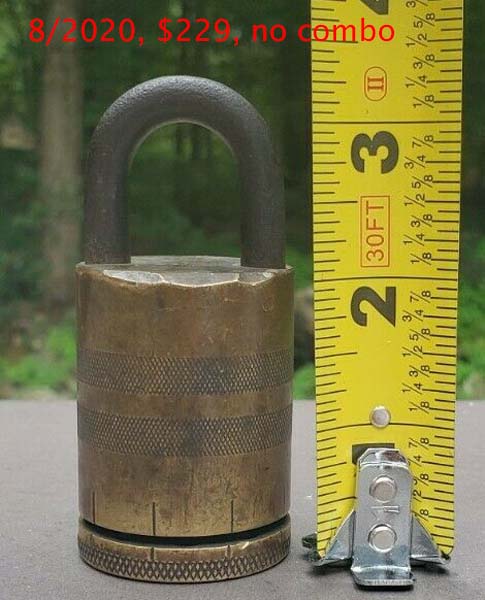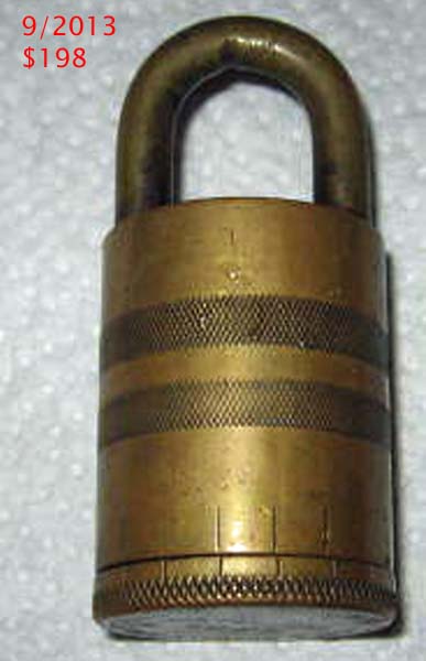 3 1/4″ high x 1 1/2″ diameter. “SOREL LOCK LIMITED SOREL CANADA MADE IN CANADA PATENTED 1921” is stamped on the base of the lock. Brass body. Brass dial. Brass shackle. Joseph Alexis Philippe De Guise Patent #’s 214420 (Canada) 1432677 (US). More…