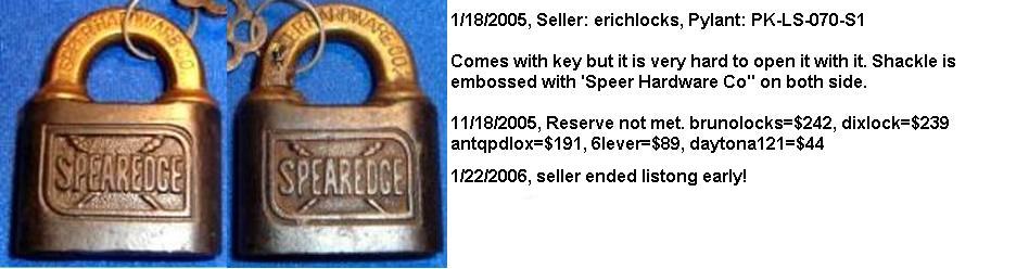 Steel body. Brass shackle. Keyway: Flat. “SPEER HARDWARE CO.” is stamped on the obverse and reverse of the shackle.
