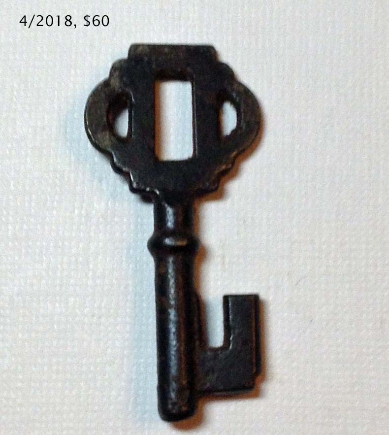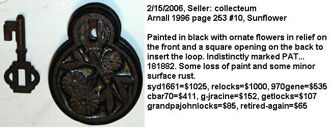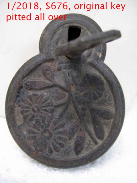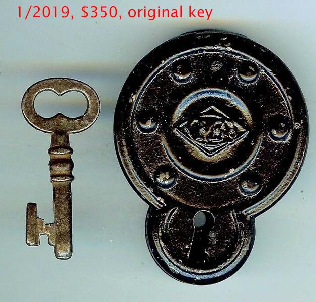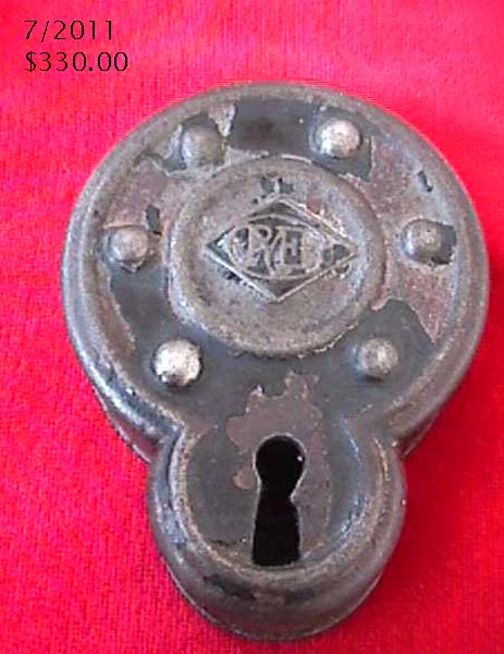 2 7/8″ high x 2 1/4″ wide. Iron. Barrel key. Black enamel paint finish. Trunk/Hasp lock. The obverse of the case has a shield type design cast on it. The R&E Co. trademark is cast on the obverse of the body. “PAT.APR.18.1882” stamped on the reverse of the case at 6 o’clock.Patent # D12891.