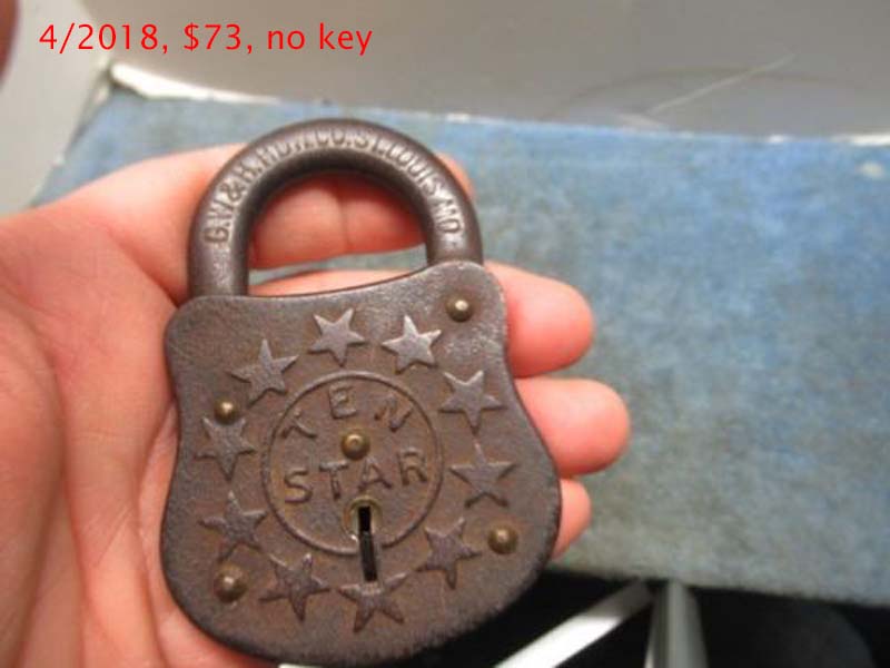 3 1/8″ high x 2″ wide x 3/8″ deep. Stamped Steel body. Steel shackle. Post key. “GELLER, WARD & HASNER HDW. CO.” is stamped on the obverse of the shackle. “MADE IN U.S.A.” is stamped on the reverse of the body.