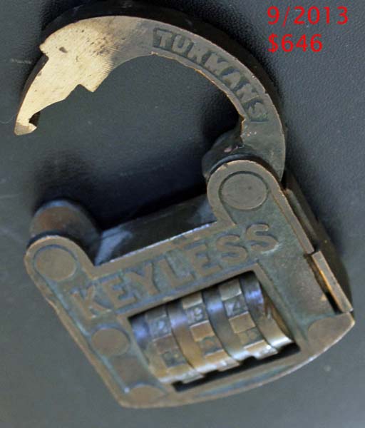 MAR.9.86″. 2 1/4″ high x 1 7/8″ wide. Brass body. Brass shackle. Brass wheels. “KEYLESS” is embossed on the obverse of the body. “PAT.MAR.9.86” is embossed on the reverse of the body. “TURMANS” is embossed on the obverse of the shackle. William B. Turman Patent #’s 337800 877682.