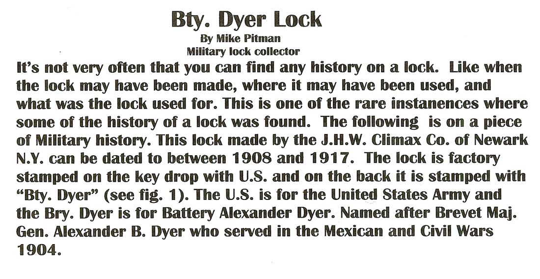 “U.S.” – “BTY. DYER.”. Brass body. Brass shackle. Lever.