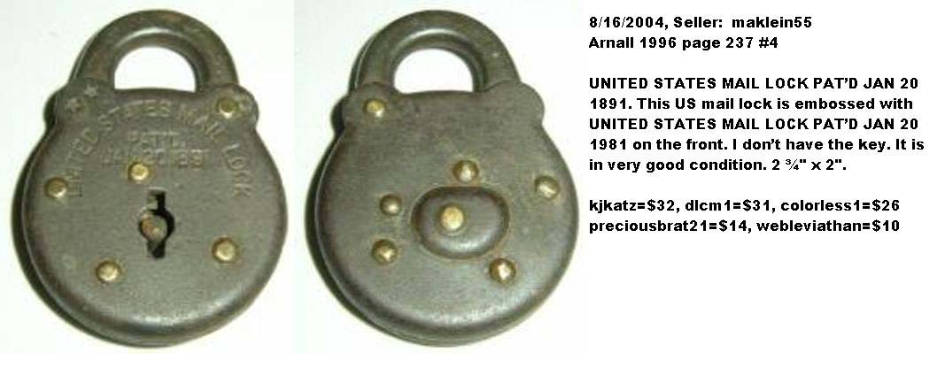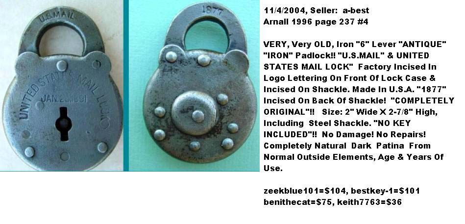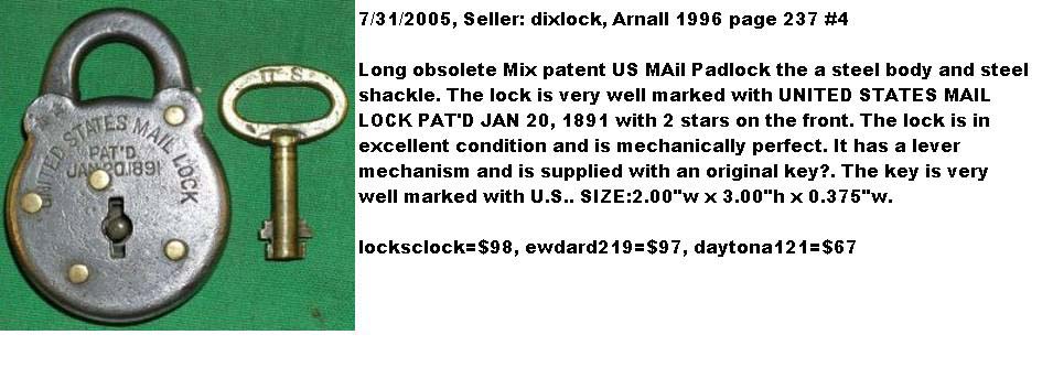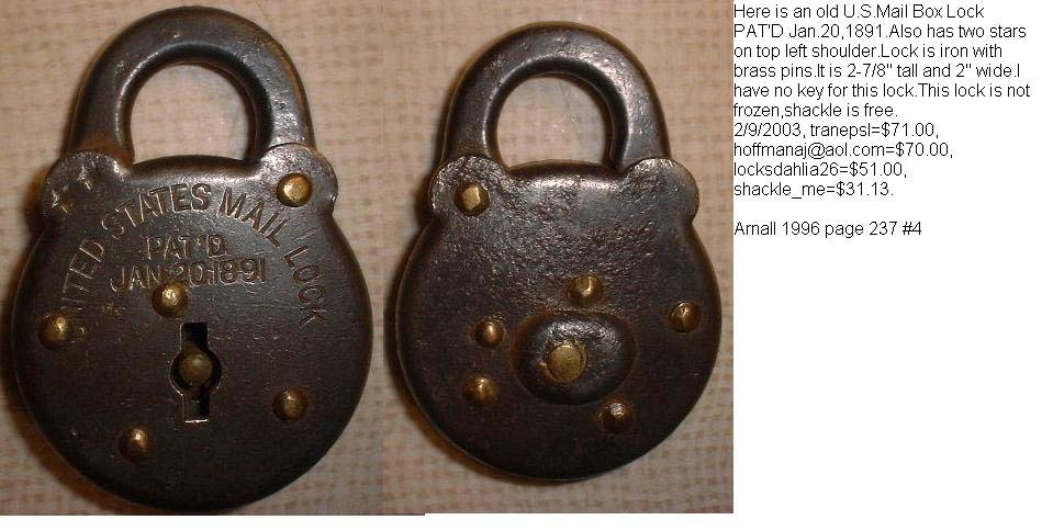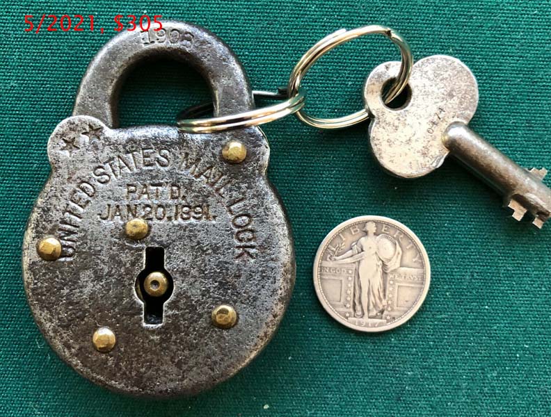 S. MAIL” – “1877”. 2 7/8″ high x 2 1/16″ wide x 7/16″ deep. Steel body. Steel shackle. Brass pins. Lever. Post key. “UNITED STATES MAIL LOCK PAT’D JAN 20.1891” is stamped on the obverse of the body. “U.S. MAIL” is stamped on the obverse of the shackle. “MADE IN U.S.A. 1877” is stamped on the reverse of the shackle. There are no stars stamped on the obverse of the case at 11 o’clock. “US” is stamped on the obverse of the key. Frank W. Mix Patent # 445121.