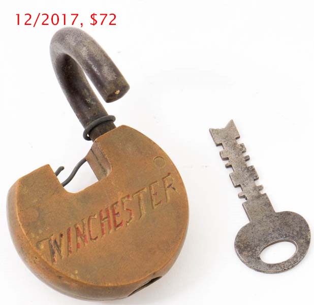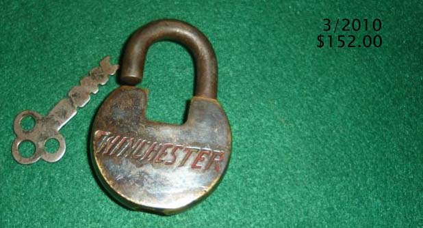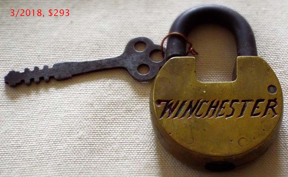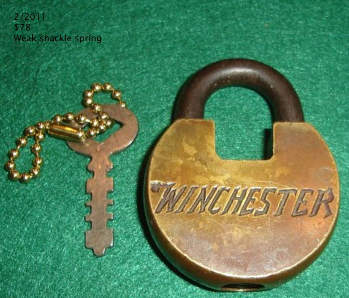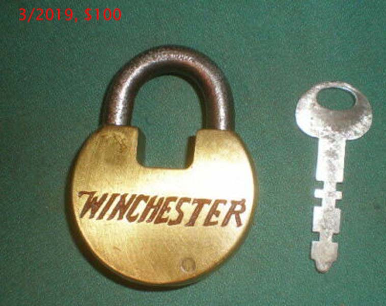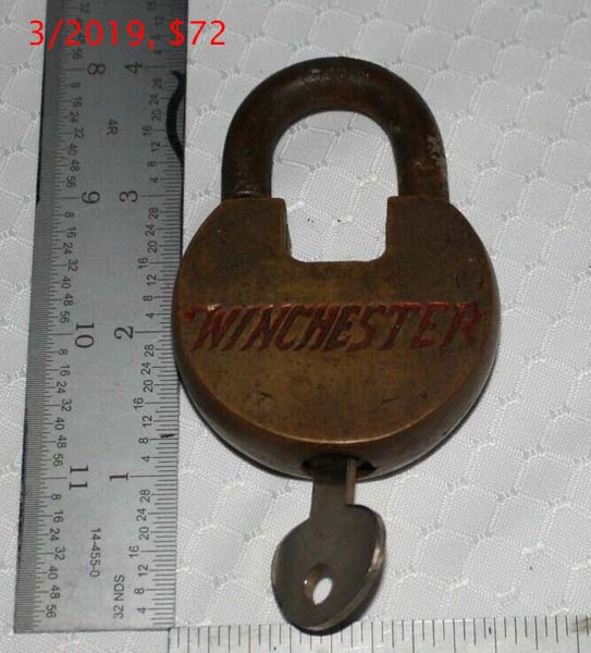 2 3/4″ high x 2 1/4″ wide. Brass body. Steel shackle. Warded. Flat key. “MADE IN USA” is stamped on the obverse of the shackle.