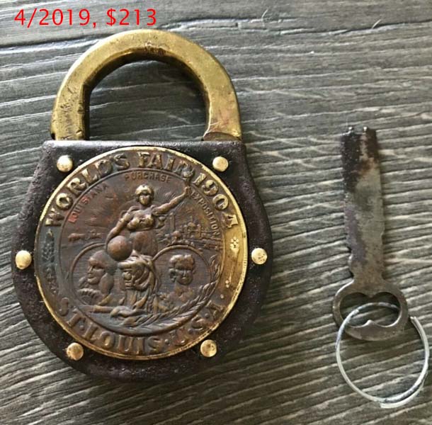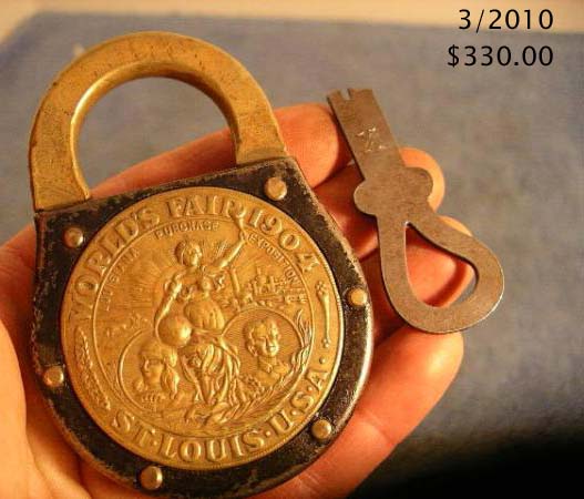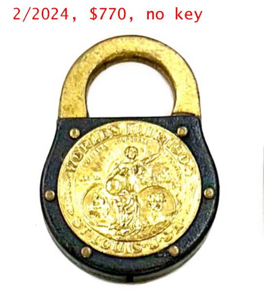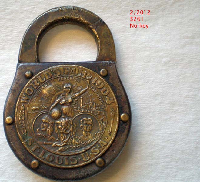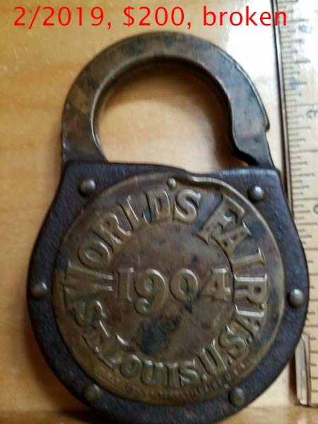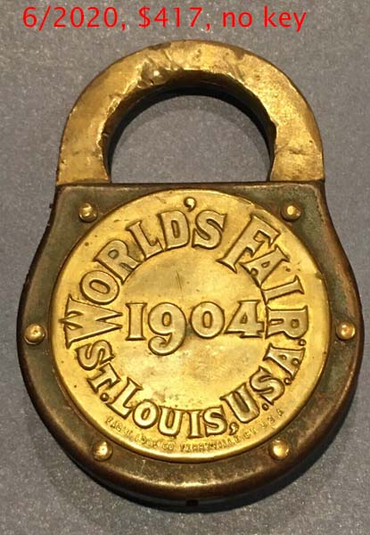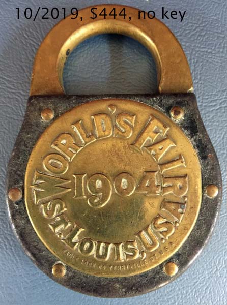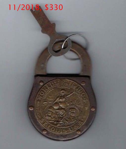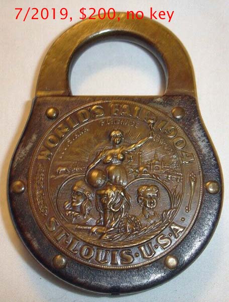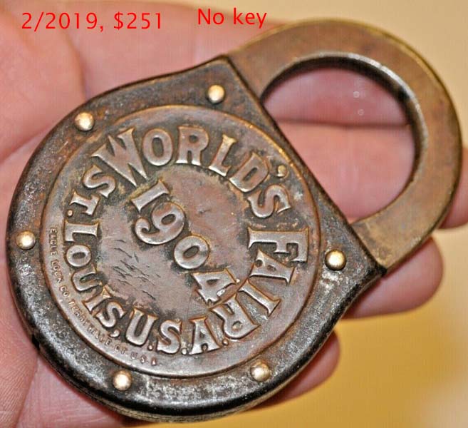 2 1/2″ high x 2″ wide x 11/16″ deep (Actual: 2.554″ high x 2.022″ wide x .668″ deep). Brass body. Steel shackle. Warded. From the “1904 St. Louis Missouri World’s Fair”. “1904” is stamped on the obverse of the case at 9 o’clock. It is not clear if “1904” was factory stamped.