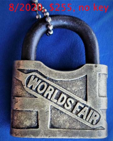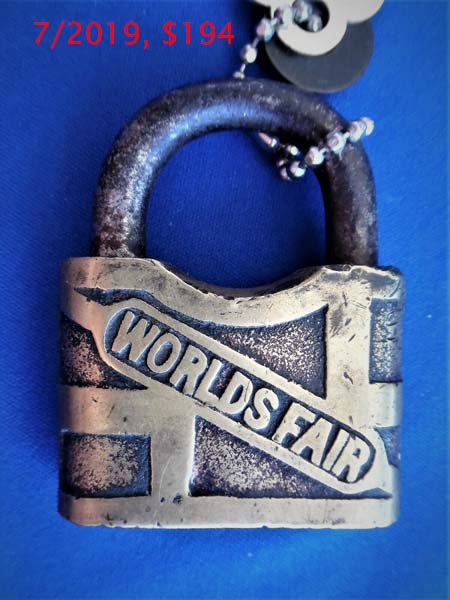 2 1/2″ high x 2″ wide x 11/16″ deep (Actual: 2.554″ high x 2.052″ wide x .665″ deep). Brass body. Steel shackle. Warded. From the “1904 St. Louis Missouri World’s Fair”.