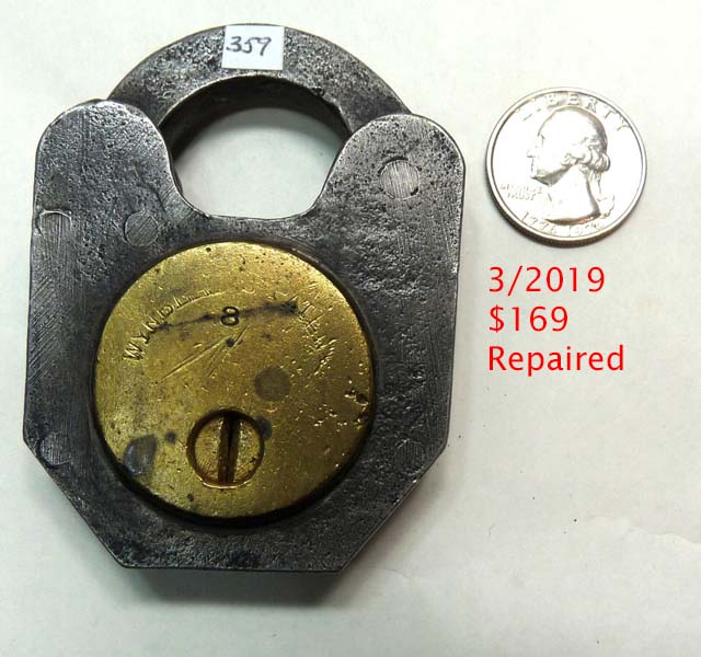 3 1/4″ high. Steel body. Steel shackle. Steel key. The keyway is spring loaded to accept the wide key. There is nothing stamped on this lock.Patent #15589.