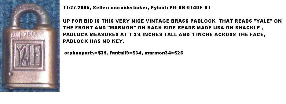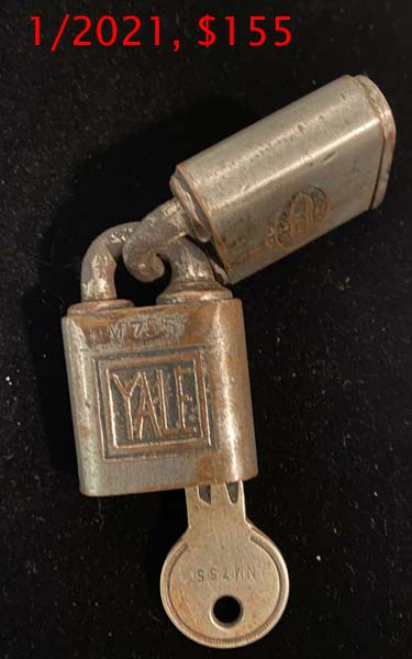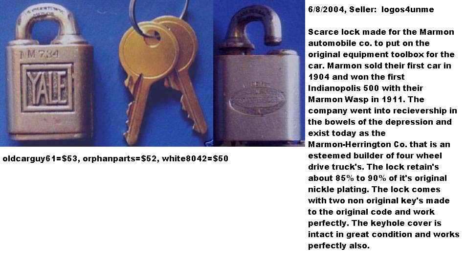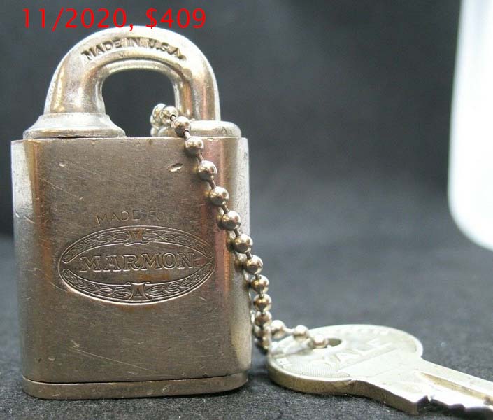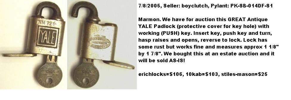 1 3/16″ wide. Brass body. Steel shackle. Keyway: Paracentric. Nickel plated finish. “NM817” is stamped on the obverse of the case at 12 o’clock. “MADE FOR” and “MARMON” is stamped on the reverse of the body. “THE YALE & TOWNE MFG. CO.” is stamped on the obverse of the shackle. “MADE IN U.S.A.” is stamped on the reverse of the shackle.