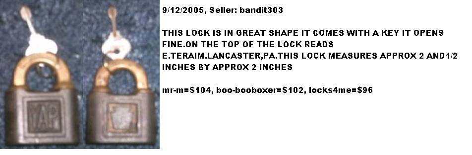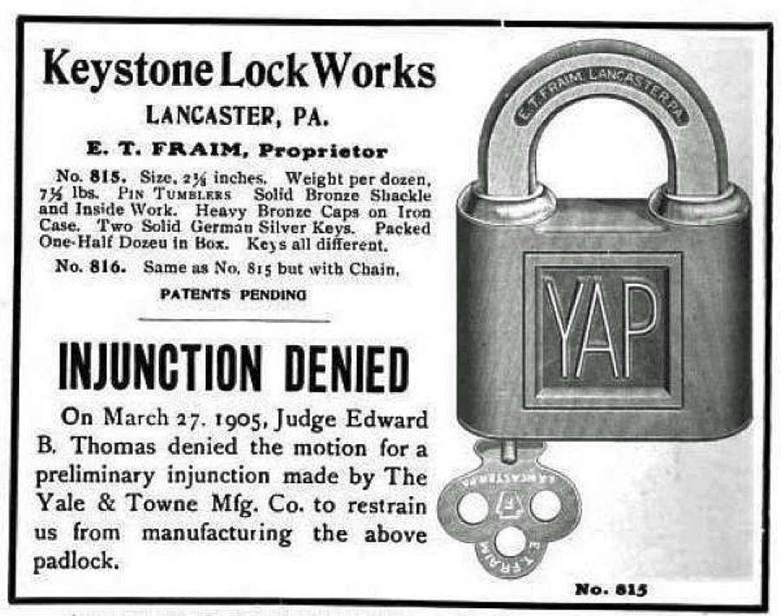 Steel body. Brass shackle. “E. T. FRAIM. LANCASTER. PA.” is stamped on the obverse of the shackle.