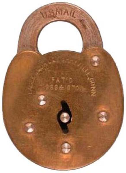 "U.S. MAIL - Eagle Lock CO" - "1873". Steel body. Steel shackle. "1873" is stamp
