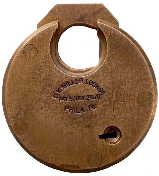 "D. K. MILLER LOCK CO. PHILA. PA PATD JULY 26.70". 2 1/2" diameter. "D. K. MILLE