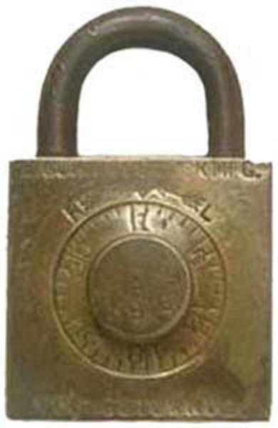 "E. GORNICEC" - Square. 1 13/16" high x 1 3/4" wide. All brass. "PAT. FEB. 29, 1