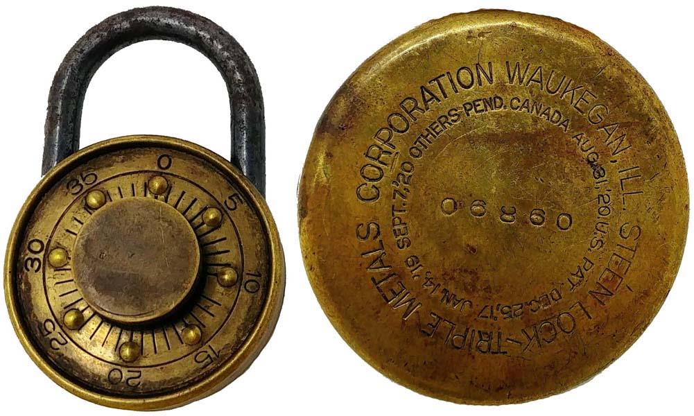 View on USPTO / Google Patents ↗This padlock was manufactured by Steen Triple Metals Corp. The original mechanism was for a trunk lock. | Classification: 70/4